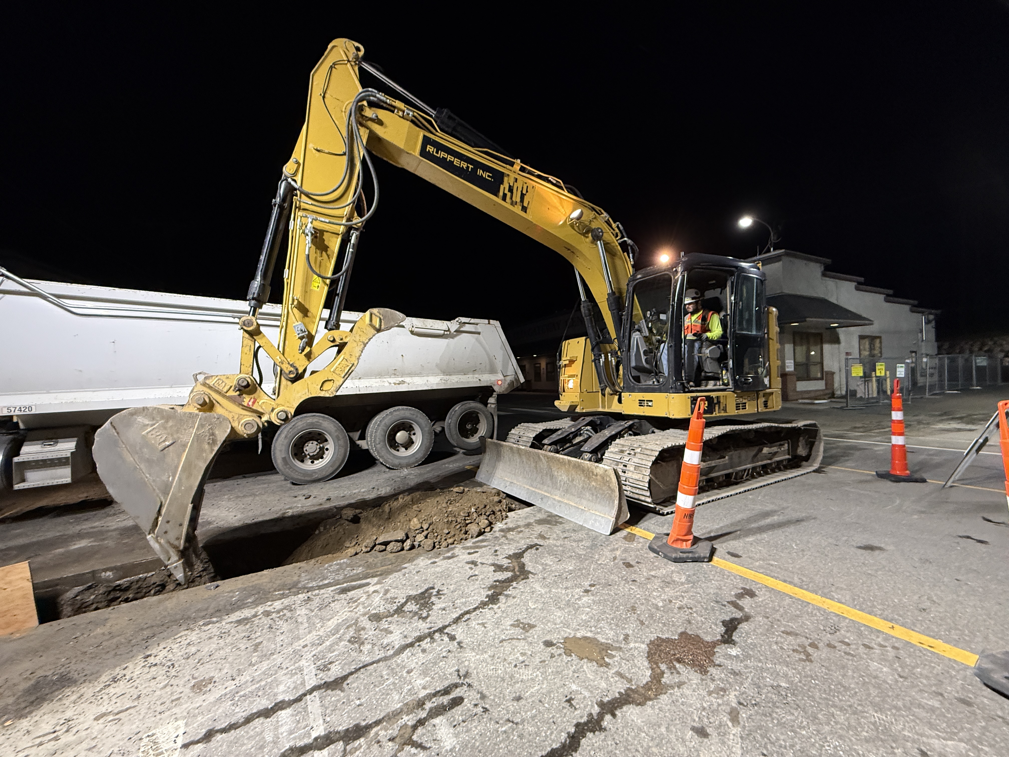 The photo shows an active nighttime construction operation where a CAT excavator is engaged in trench excavation for an underground utility project. The excavator is loading soil onto a nearby dump truck. The site is marked with traffic cones, indicating a controlled work zone. The presence of an operator in the excavator shows ongoing manual control.