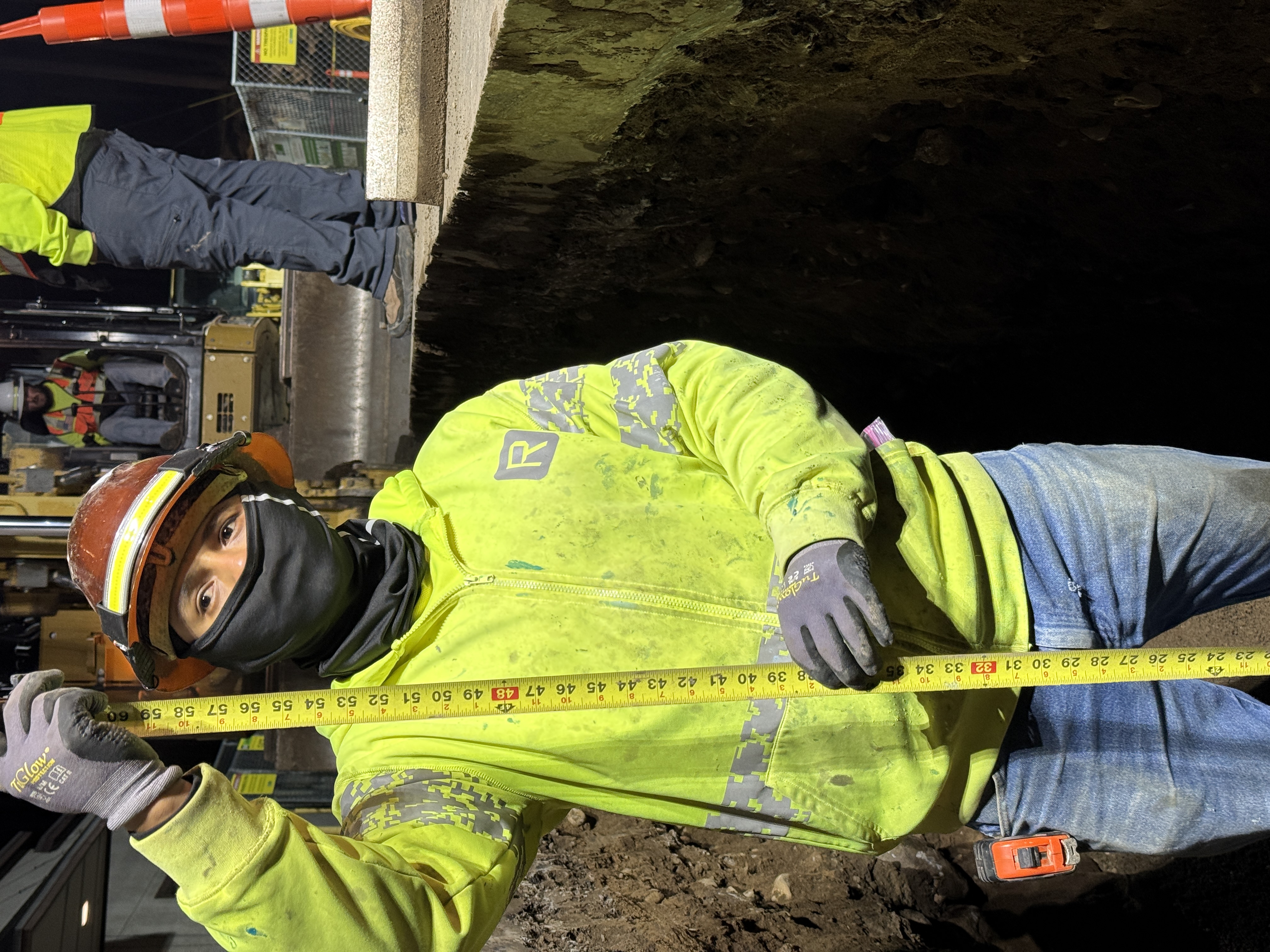A construction worker is measuring the depth of a trench using a measuring tape. The trench appears to be part of an underground utility installation project, with the worker equipped for night work as indicated by the artificial lighting. The surrounding soil is exposed, and an excavator is visible in the background, suggesting active excavation work.