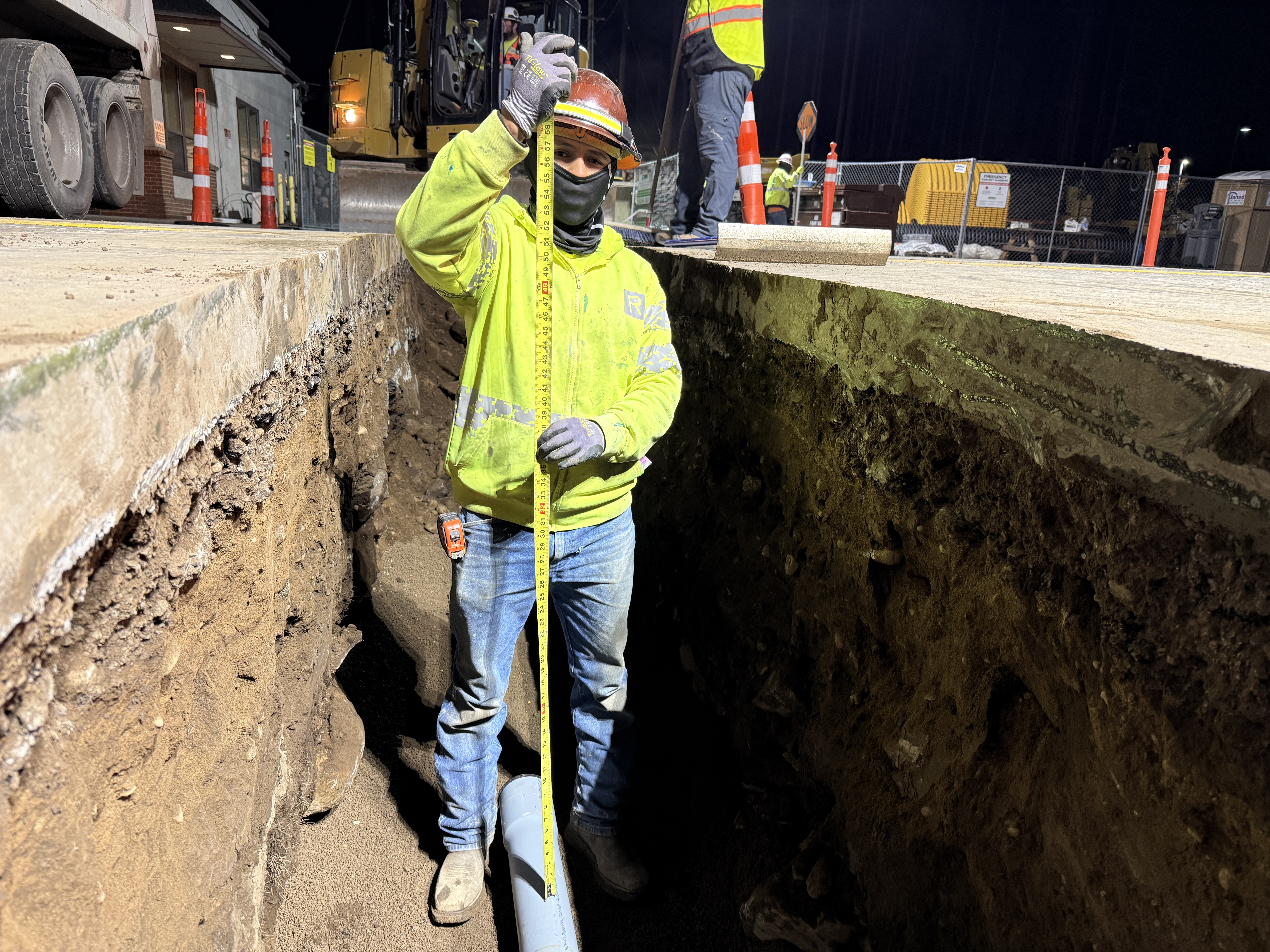 The image shows an active water infrastructure construction project where a worker is measuring the depth of a freshly dug trench. A pipe is being prepared for installation at the bottom of the trench. The site appears to be in the pipeline installation stage with supporting machinery visible in the background.