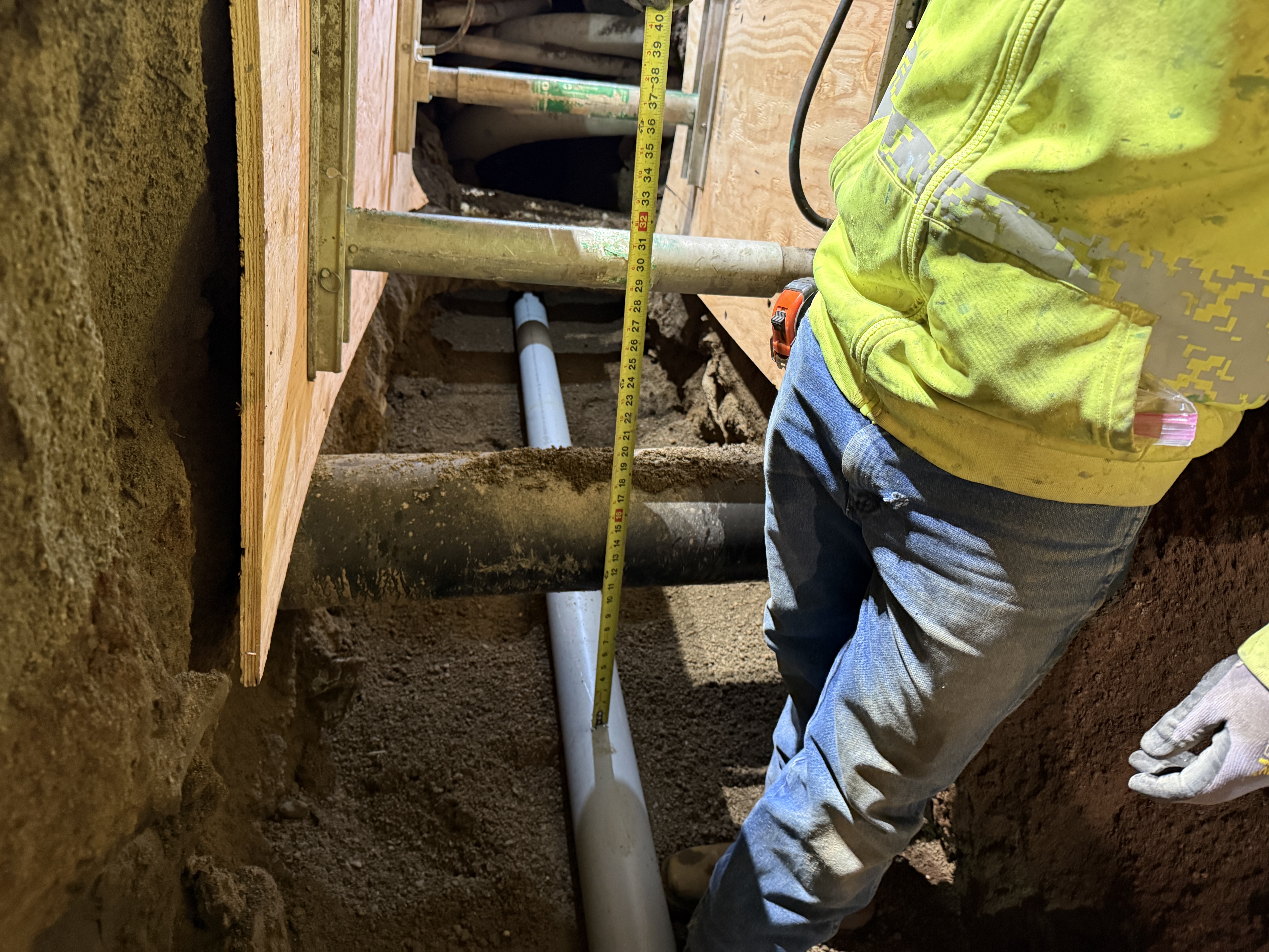 The image depicts an underground utility work site where a worker is involved in pipeline installation. Visible are two parallel pipes, one appears to be plastic while the other is metal and slightly corroded, running horizontally. The surrounding area is supported by plywood shoring, and the worker is using a tape measure, likely to ensure precise placement or measurement of the pipes.