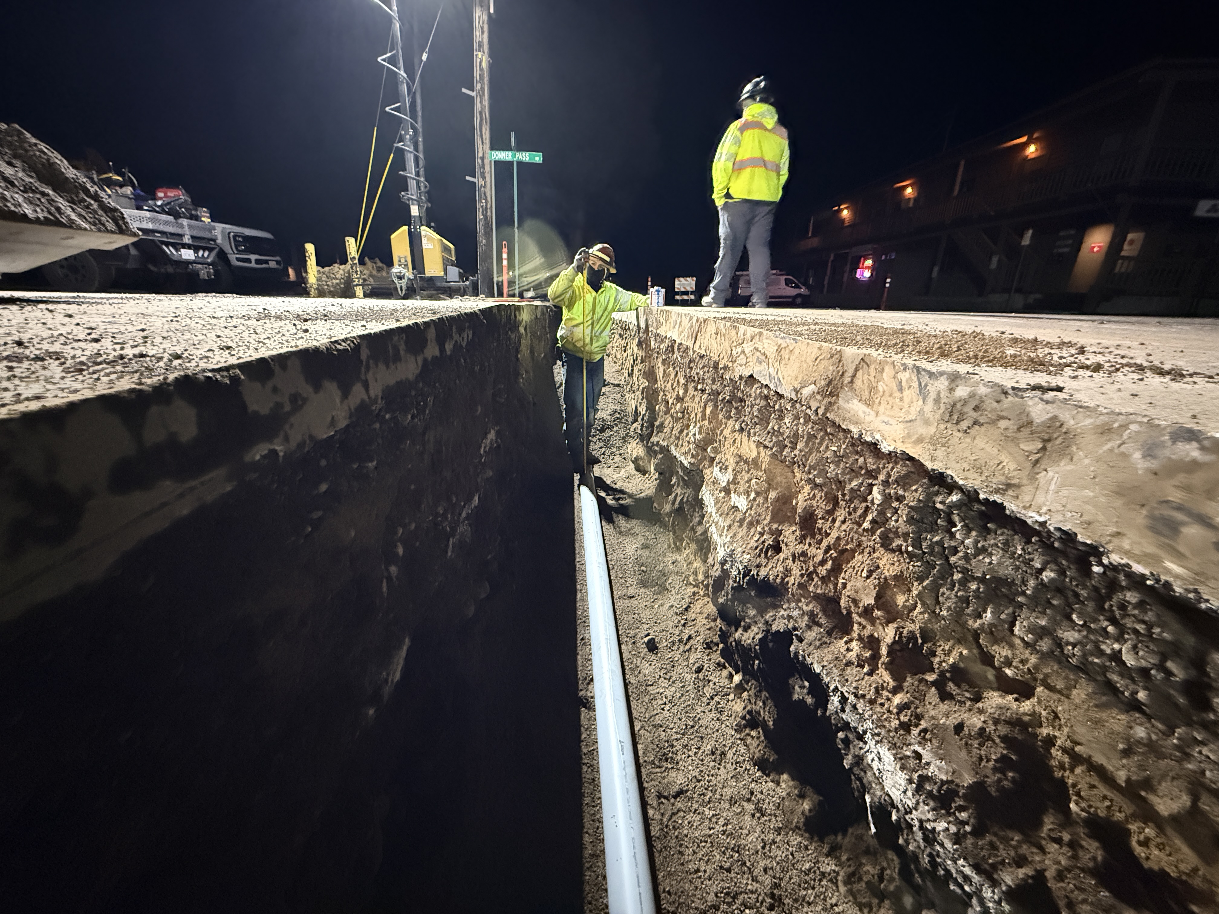 A worker is standing in a trench placing or inspecting a white PVC pipe, indicating pipeline installation in progress. The trench is deep and lined with exposed earth and concrete, suggesting ongoing work to lay underground utilities. The lighting is artificial, indicating nighttime operation and emphasis on maintaining work schedules despite low natural light.