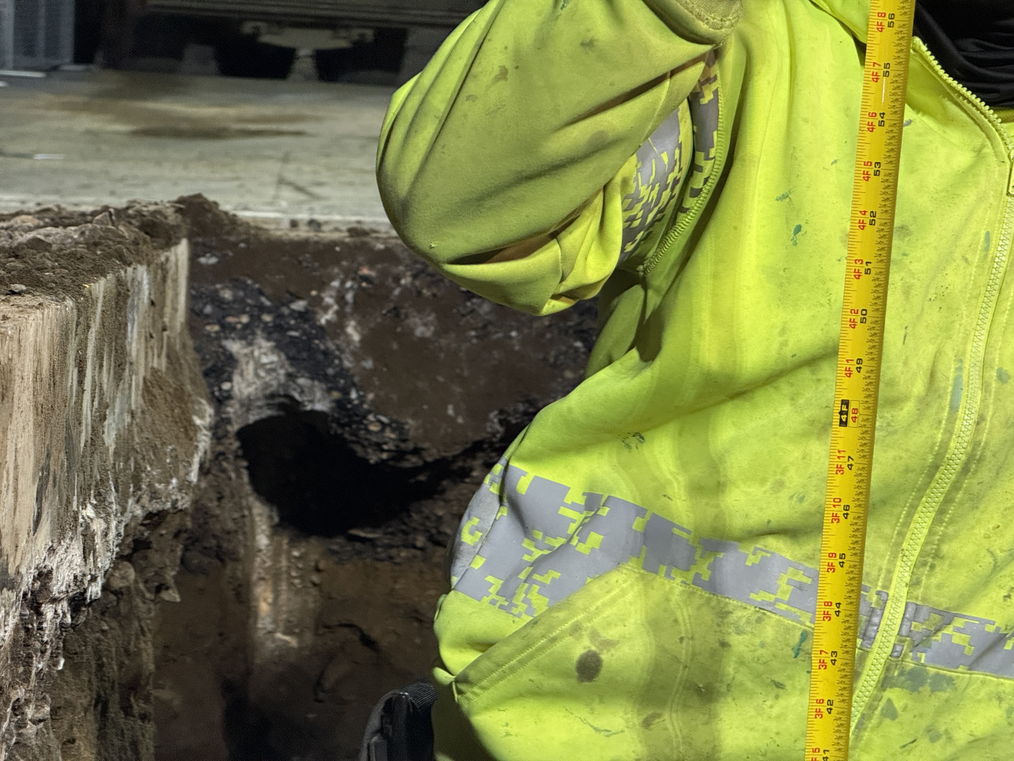 The photo shows a construction worker measuring the depth of an excavated trench beside a structure. The worker is wearing a high-visibility jacket and holding a measuring tape. The trench appears to be in the early stage of excavation, with exposed soil and damp conditions visible.