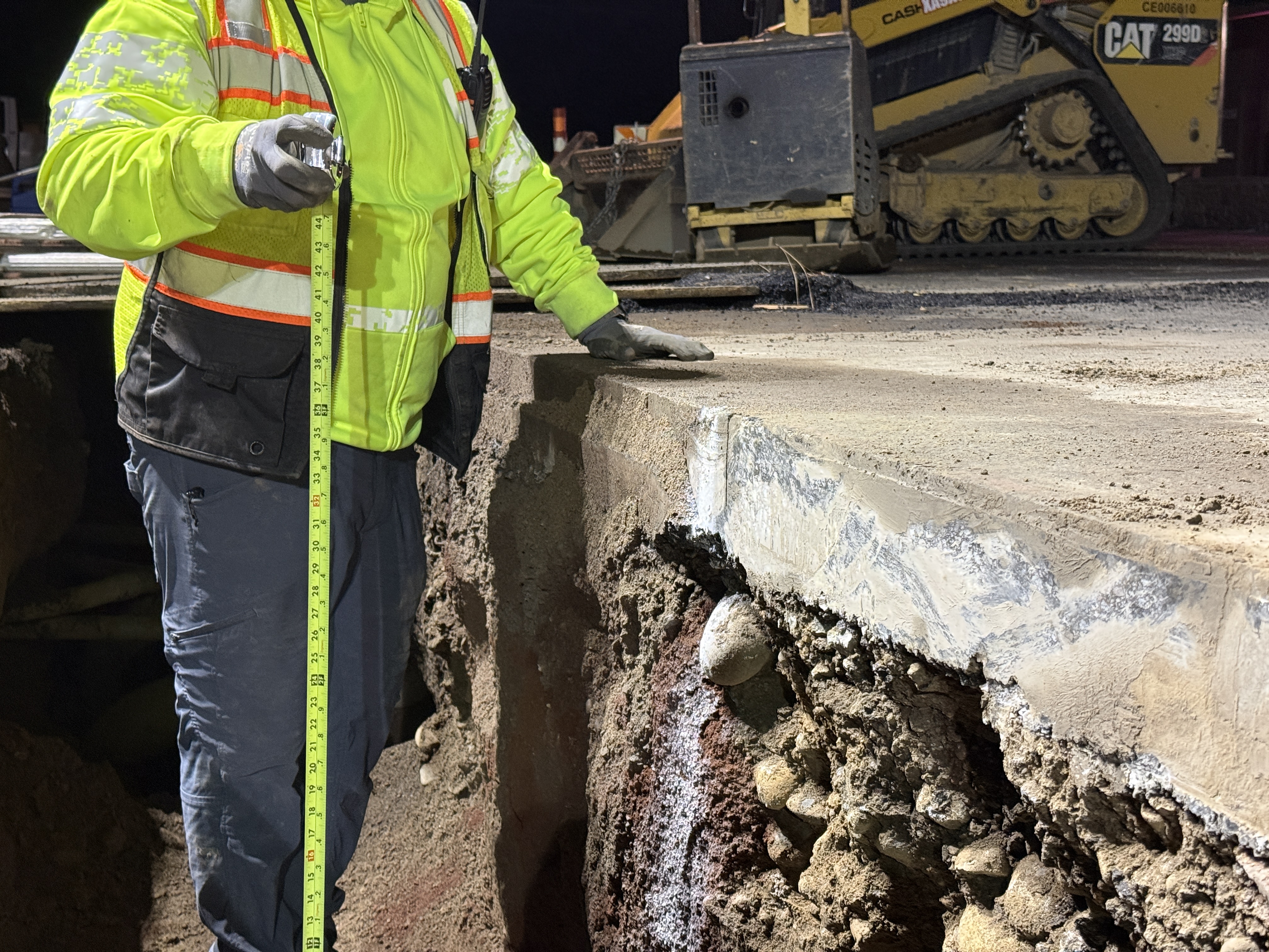 The image shows a construction worker measuring the depth of an excavated trench beside a concrete slab. The trench appears to be part of underground utility work, likely involving pipeline installation or inspection. Visible materials include soil, concrete, and aggregate, indicating early to mid-stage construction activities.