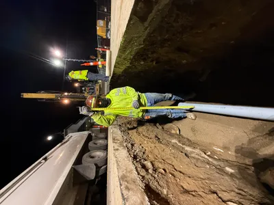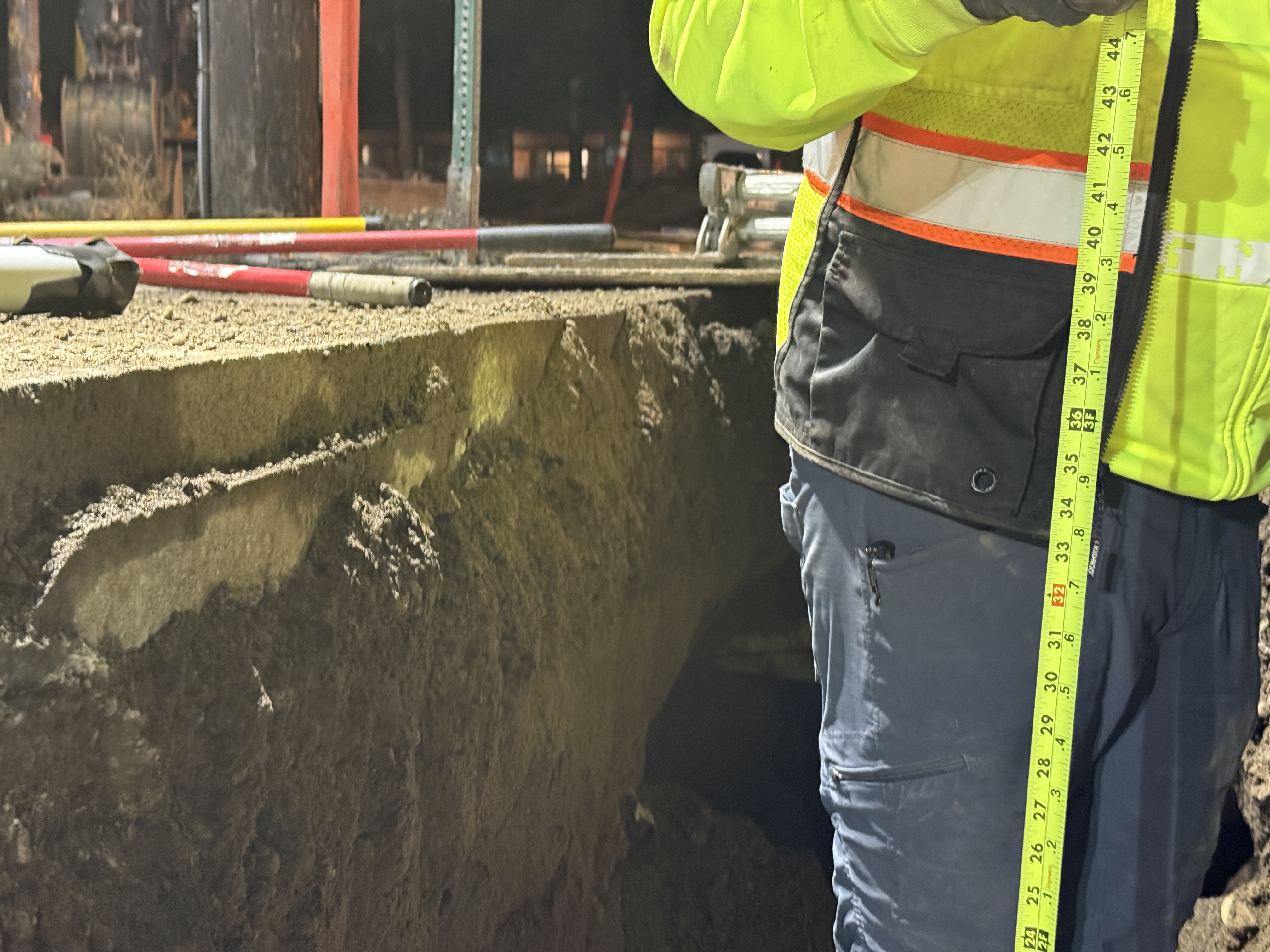 The photo shows a construction inspection activity taking place in a trench at night. A worker is measuring the depth of the trench using a tape measure marked with inches. The trench walls appear to consist of compacted soil, suggesting recent excavation.