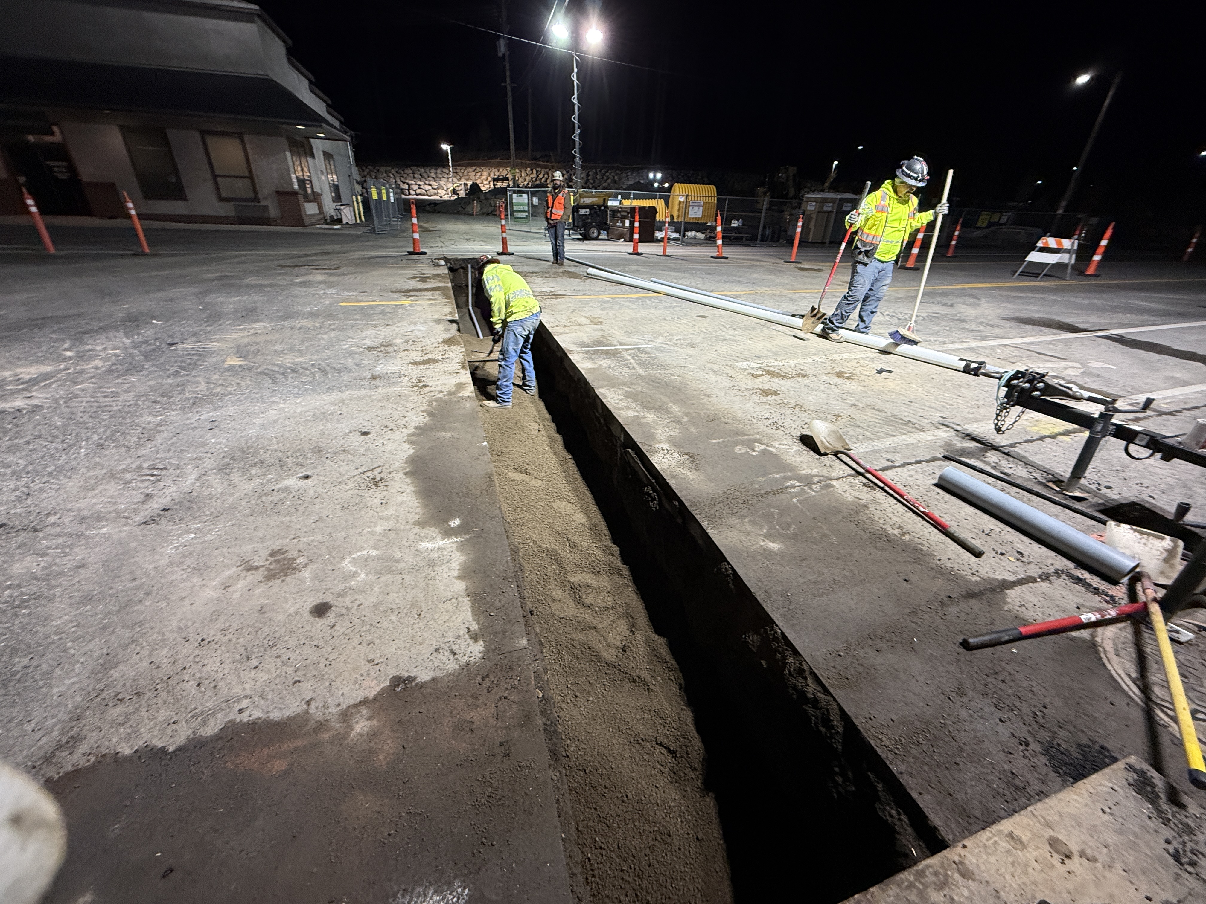 The photo shows nighttime pipeline installation work where workers are engaged in laying a pipeline into a freshly excavated trench. The trench appears adequately shored with no visible water ingress, and workers are aligning pipe sections on sandy bedding. Traffic cones and barriers are placed around the perimeter, indicating controlled access to the worksite.