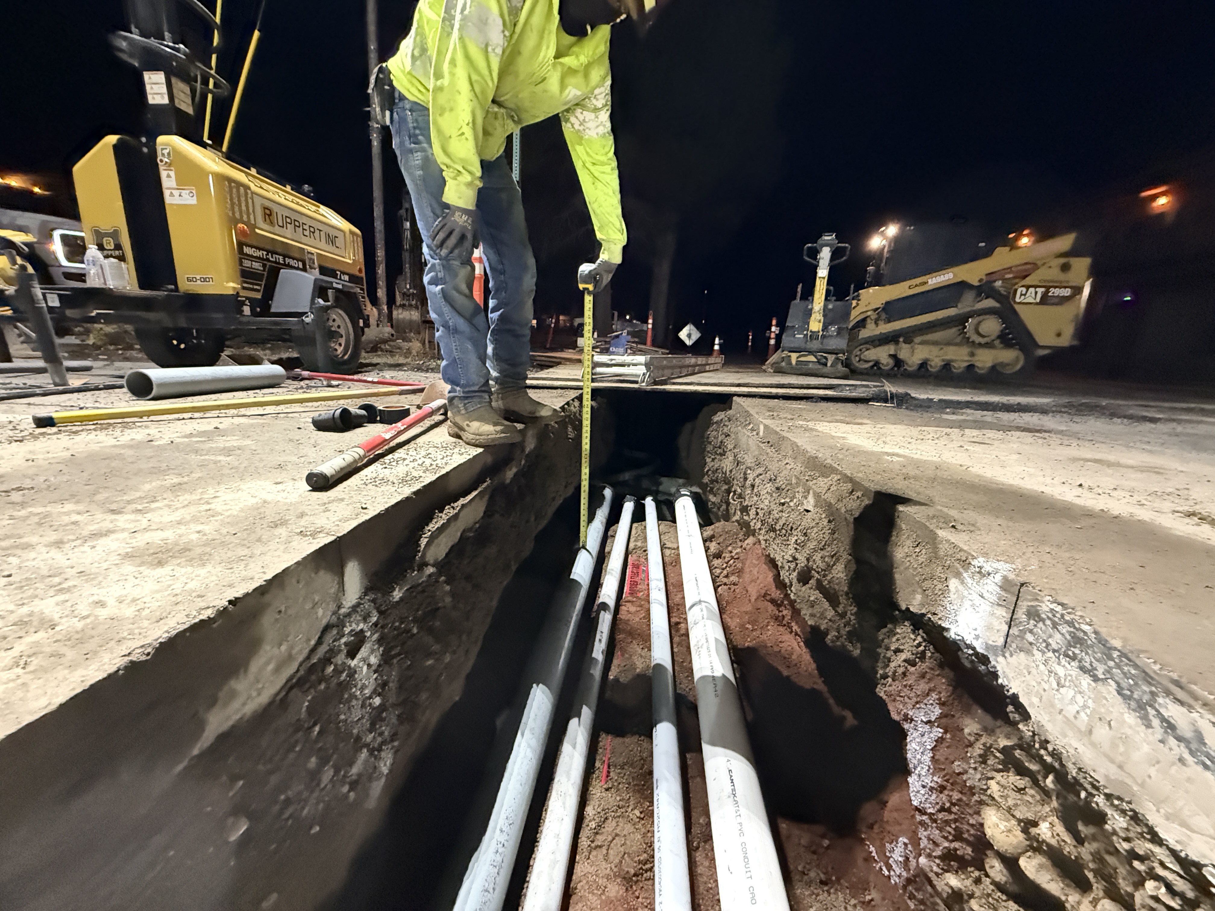 The photo shows a construction worker measuring a trench depth with several PVC conduits already installed, indicating active underground utility work. The trench appears to be freshly excavated, with protective shoring visible along the sides, suggesting an early stage of conduit installation. Heavy machinery is positioned nearby, highlighting the ongoing excavation and infrastructure installation operations.
