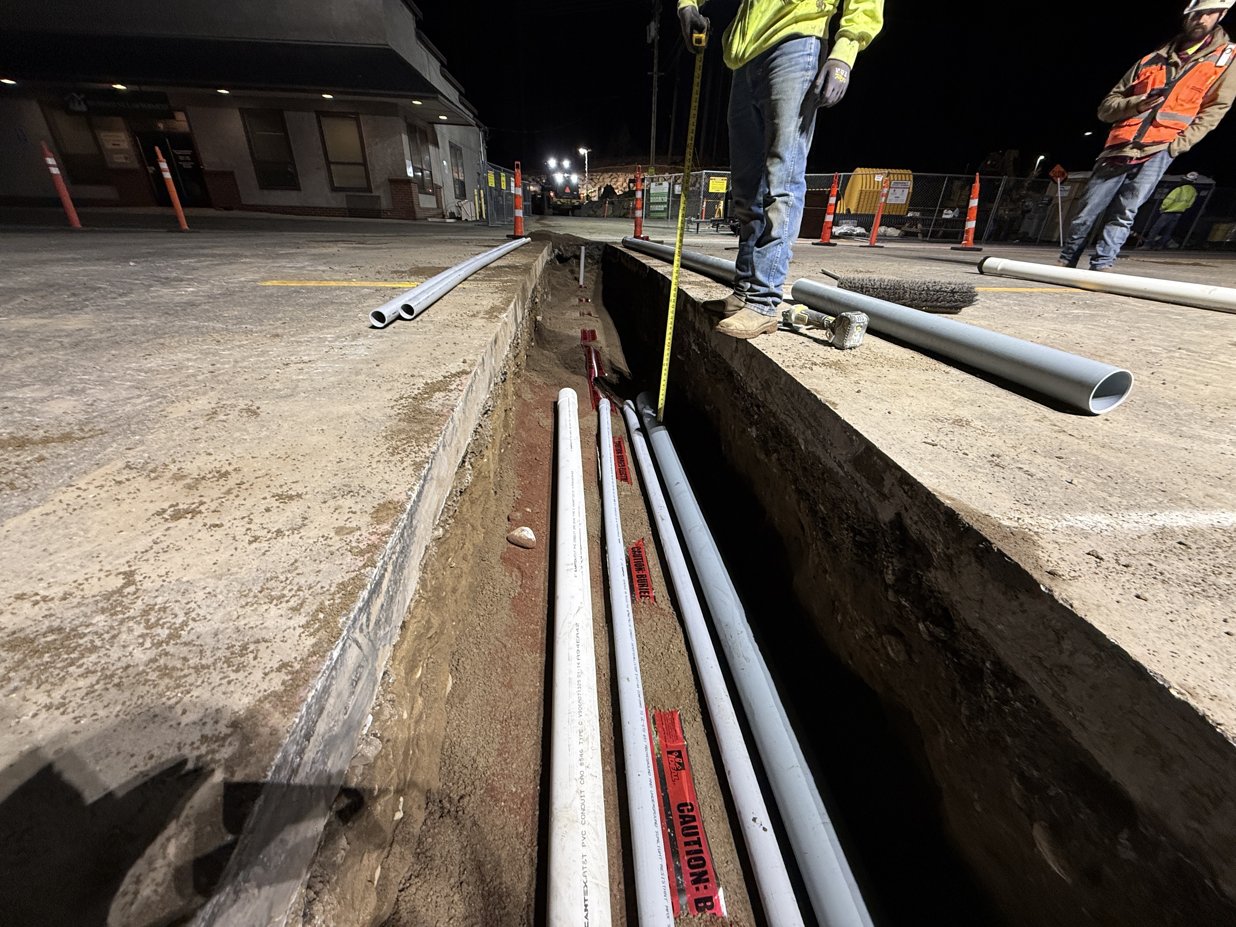 This photo shows construction workers installing electrical conduits in a trench along a paved area. PVC electrical conduits are being laid in a neatly excavated trench, with caution tape visible for marking buried utilities. A worker is measuring the depth of the trench, indicating precision in laying utilities for accurate installation.