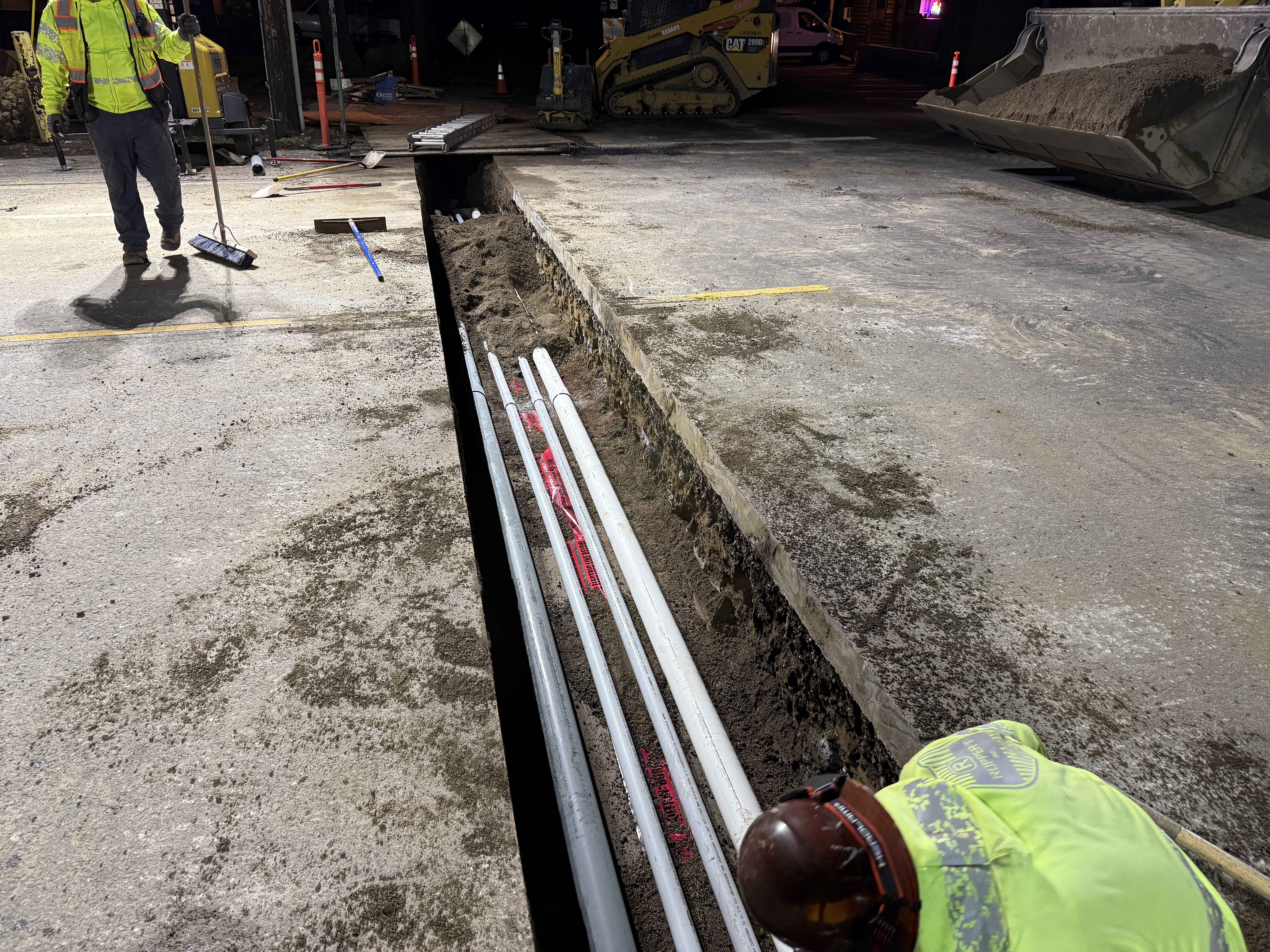 The image shows a trench excavation underway for the installation of multiple PVC conduits, indicating a utility infrastructure project in progress. Workers are preparing the area for backfilling after placing the conduits, and the site appears to be in the mid-construction phase. A backhoe loader is parked nearby to facilitate the backfill process, alongside tools like brooms for cleaning the site.
