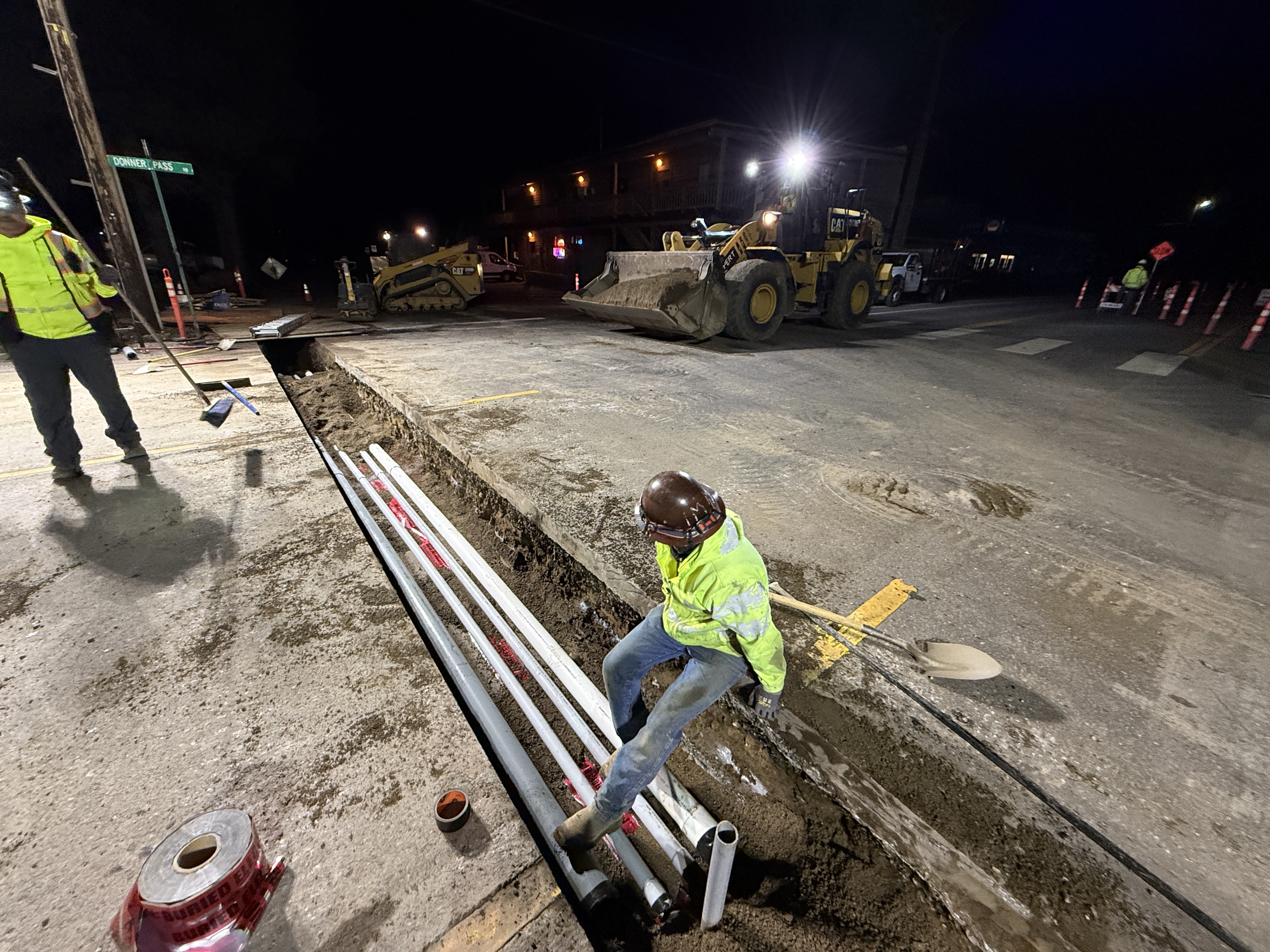 The image depicts a nighttime construction scene where workers are installing underground utility conduits. A trench has been excavated and several white and red conduit pipes are laid in it. A person is sitting by the trench, holding a shovel, likely involved in the trenching or backfilling process. Heavy machinery such as loaders are actively repositioning materials or preparing the surface.