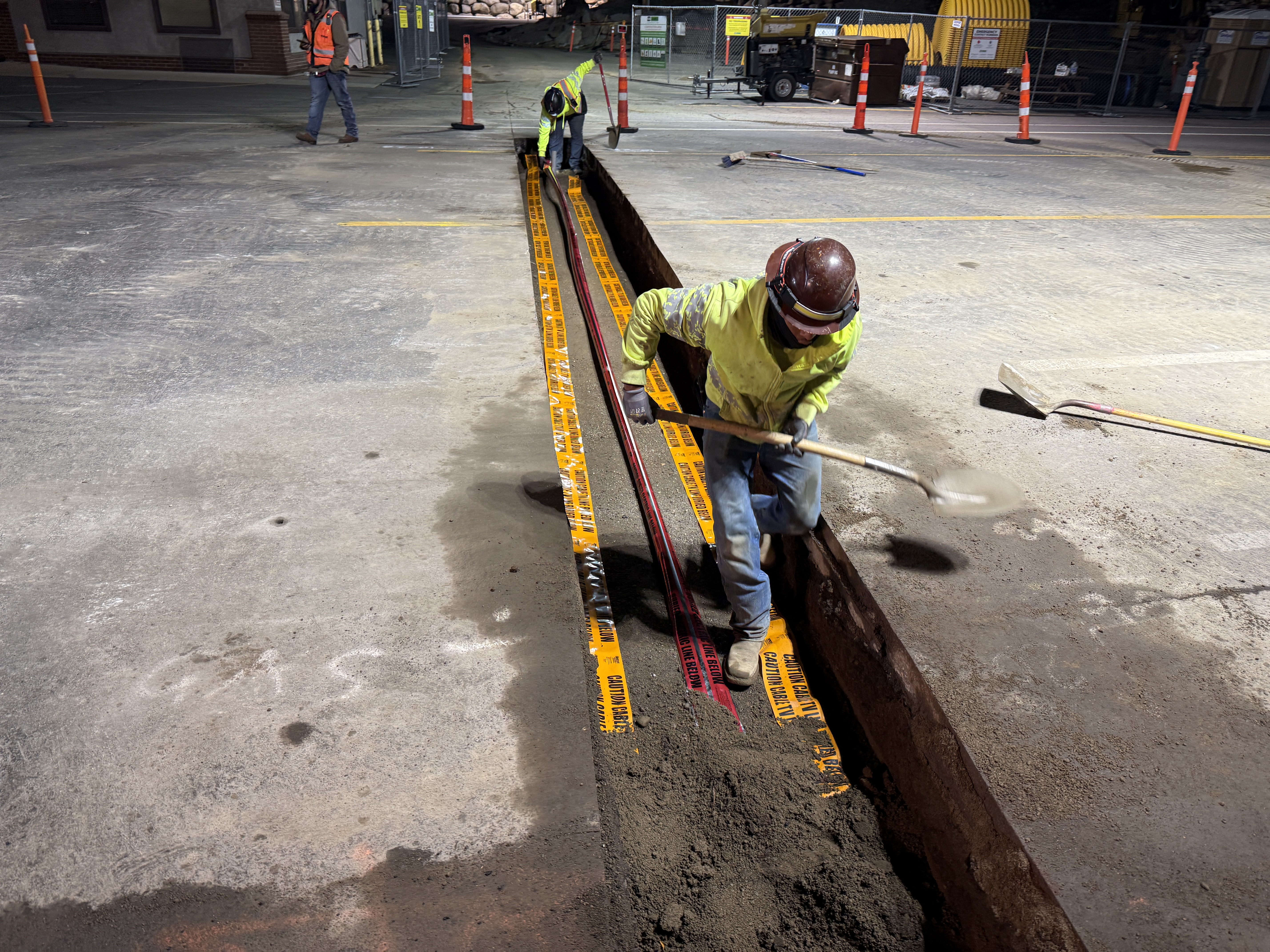The image shows construction workers engaged in backfilling a trench after laying down utility lines marked with caution tape. Two distinct colored tapes can be seen, indicating different utility services below the surface. The trench is being backfilled using shovels, and safety cones surround the work area.