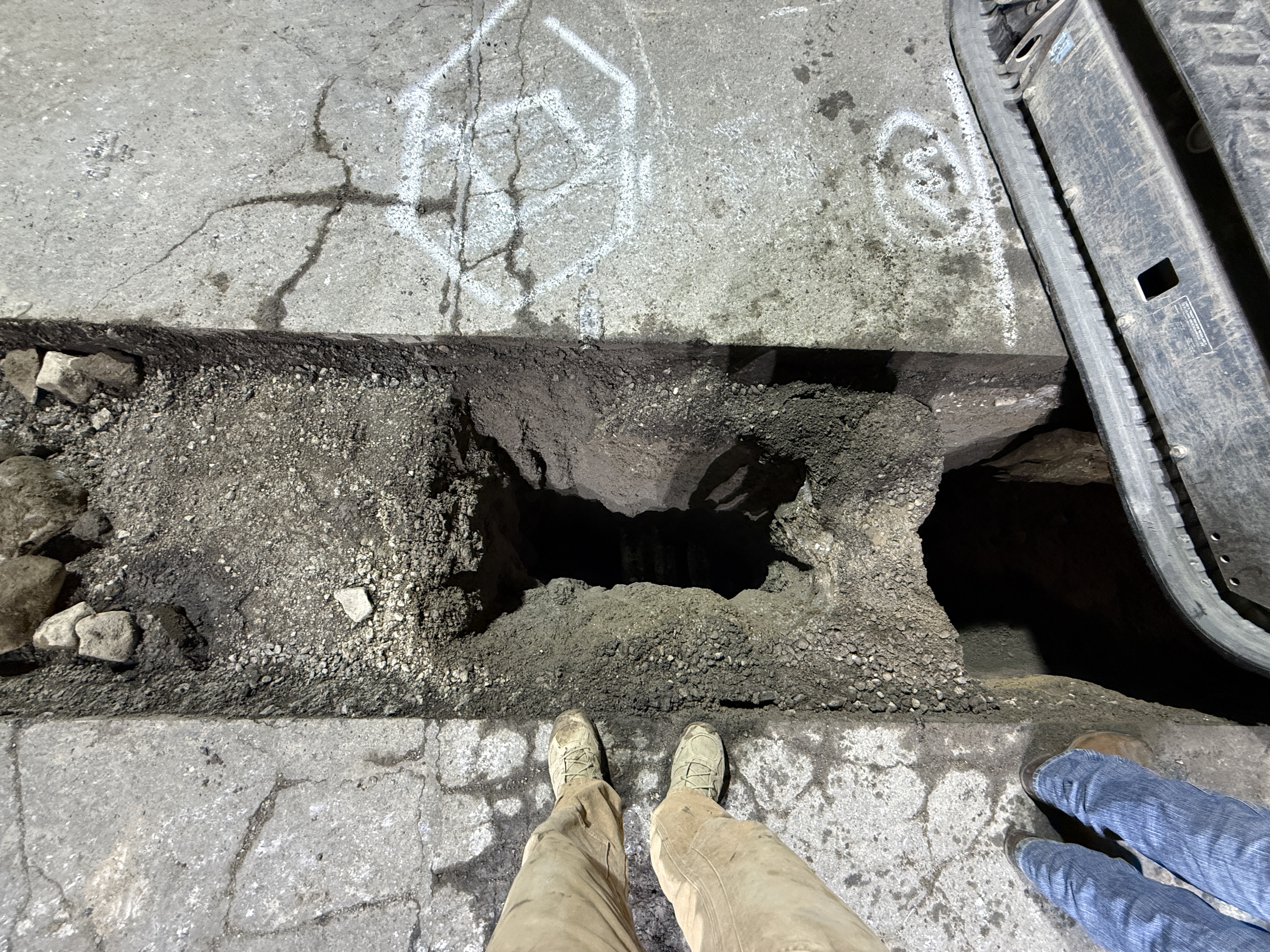 The photo shows a trench excavation in progress with exposed soil and concrete surfaces. The trench appears to be narrow and deep, possibly for a future pipeline or utility installation. There are signs of previous concrete work, evident by the surrounding cracked road surface and chalk markings on the concrete, indicating planned work locations.