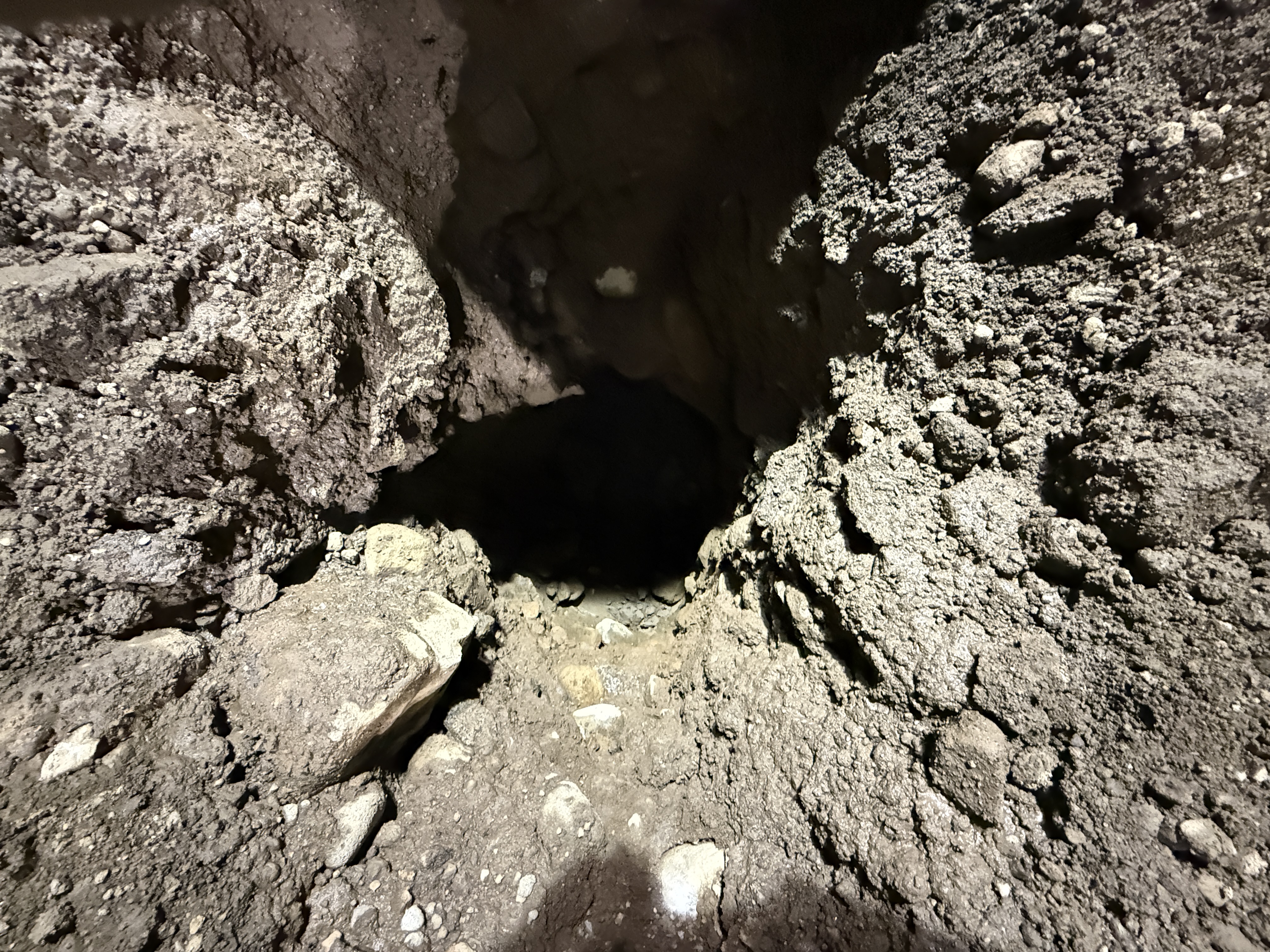 The image displays an excavation site with exposed soil and rocks. There are no visible pipeline components, fittings, or construction materials installed yet, suggesting the excavation is in an initial phase. The soil appears compacted but includes rocky elements, indicating a need for careful handling in pipeline installation phases. There is no immediate activity by personnel evident in the frame.