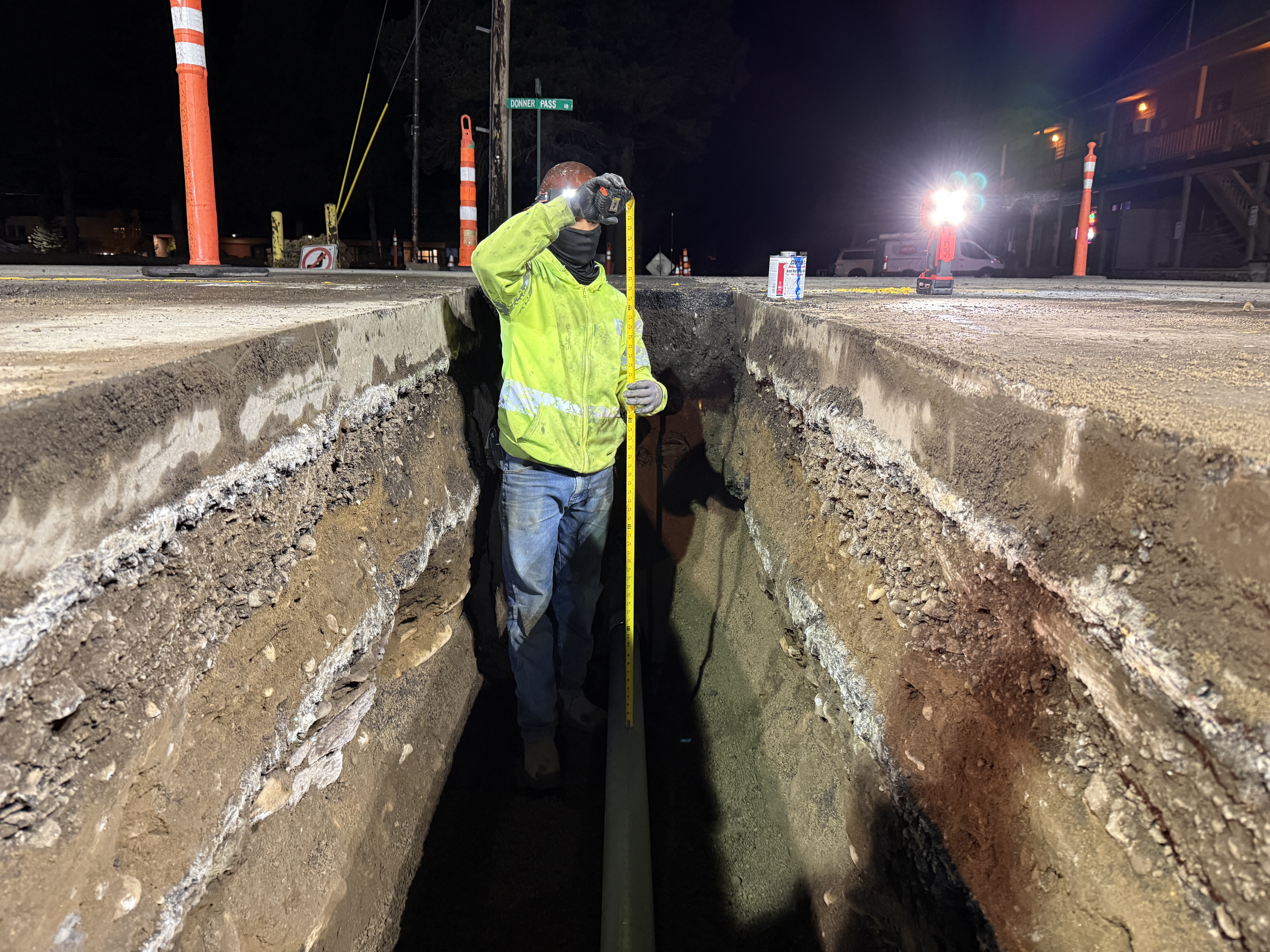 The photo depicts a construction worker measuring a newly installed pipe in a trench. The worker is wearing high-visibility clothing, and the trench shows clearly stratified soil layers. Several safety cones are positioned near the work area, indicating active utility installation. A bright construction light illuminates the nighttime work site, emphasizing the depth and precision required for the pipeline installation.