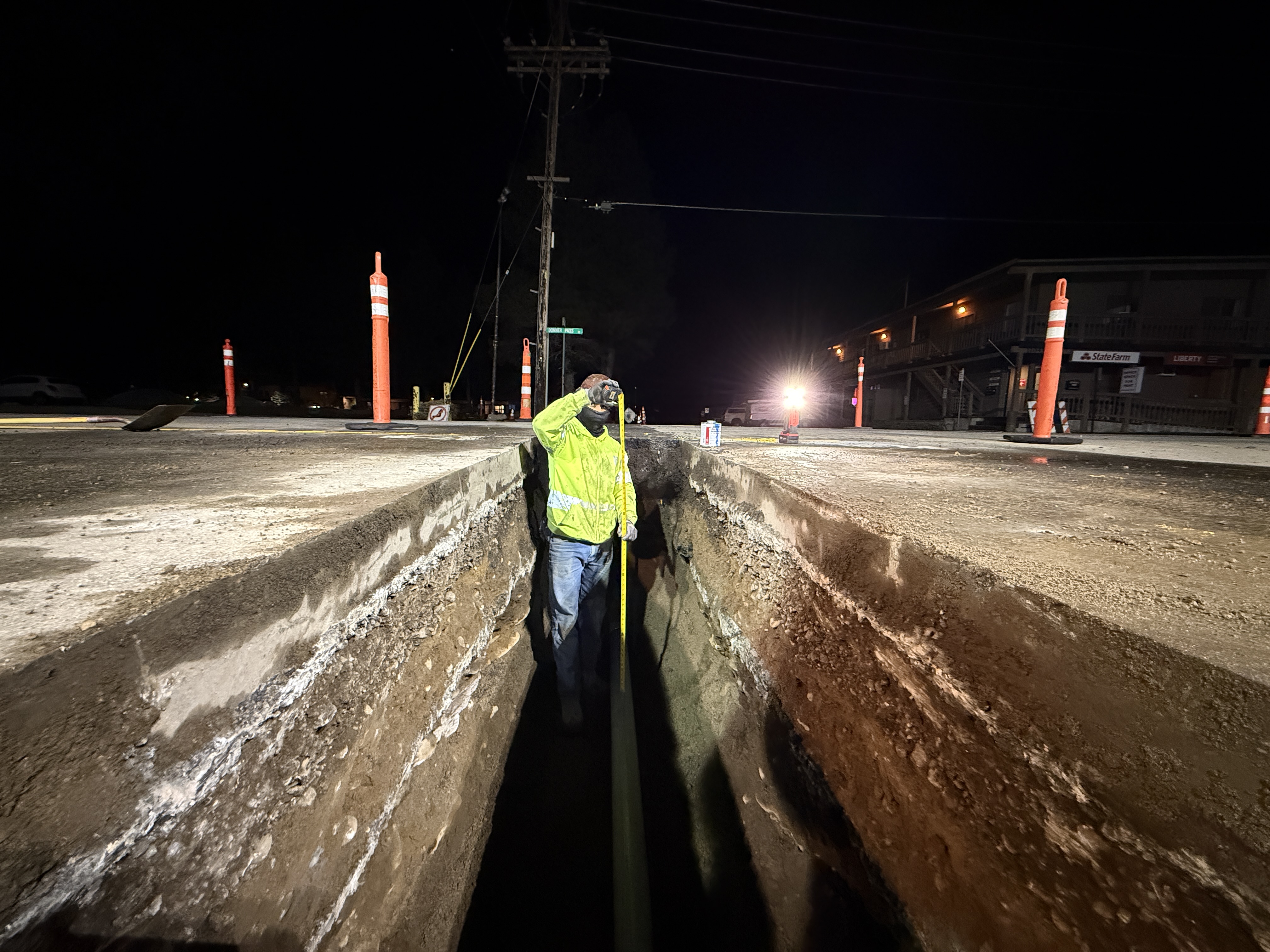 The construction is in the mid phase with a fully excavated trench. The work is taking place at night under artificial lighting with stable dry soil conditions.