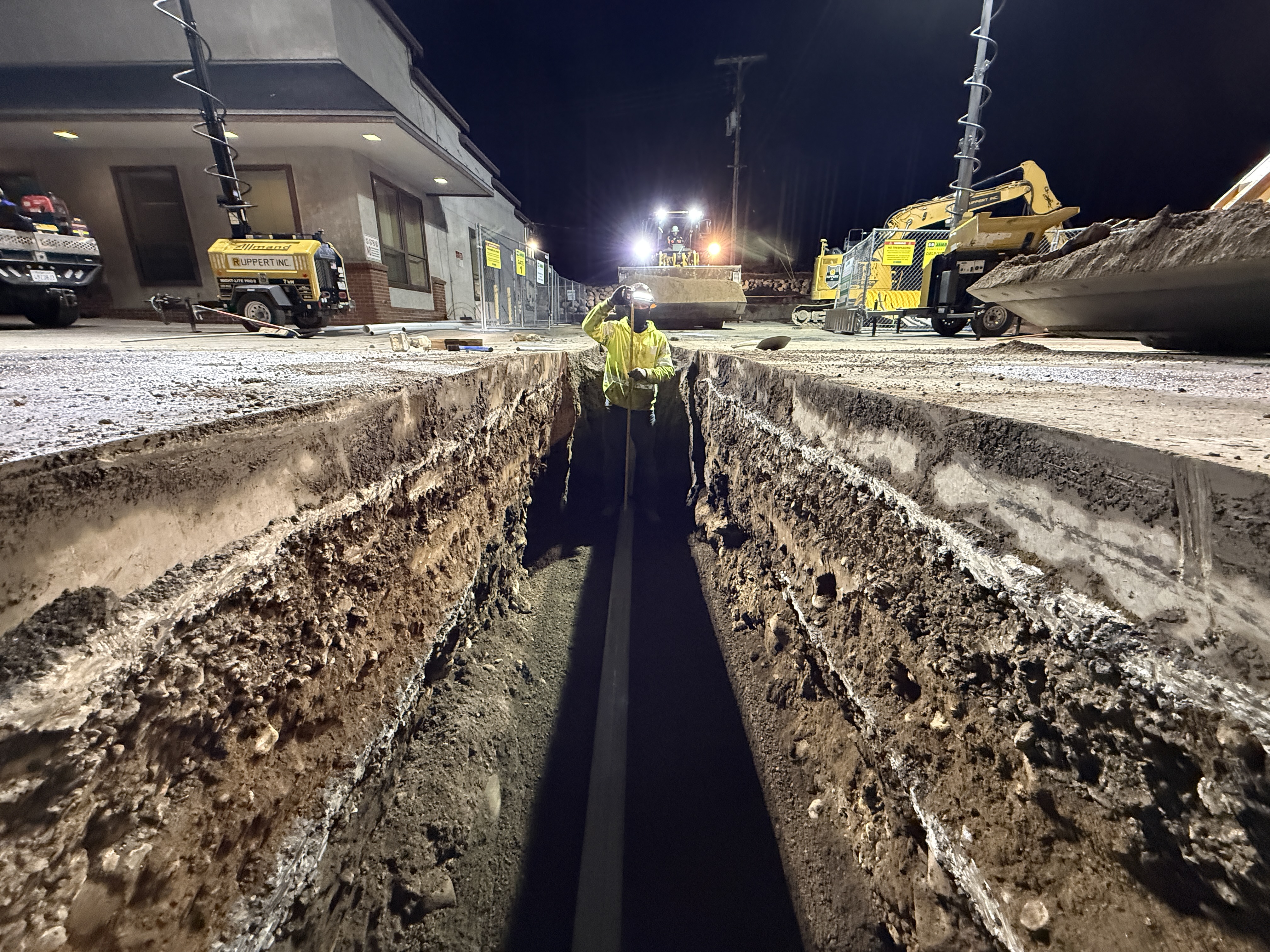 The photo shows an active trench excavation at a construction site, with a worker inspecting or working inside the trench. The trench has well-defined sediment layers, indicating ongoing excavation likely for underground utility installation. Large construction machinery and portable lighting equipment are visible, suggesting night work under artificial lighting conditions.