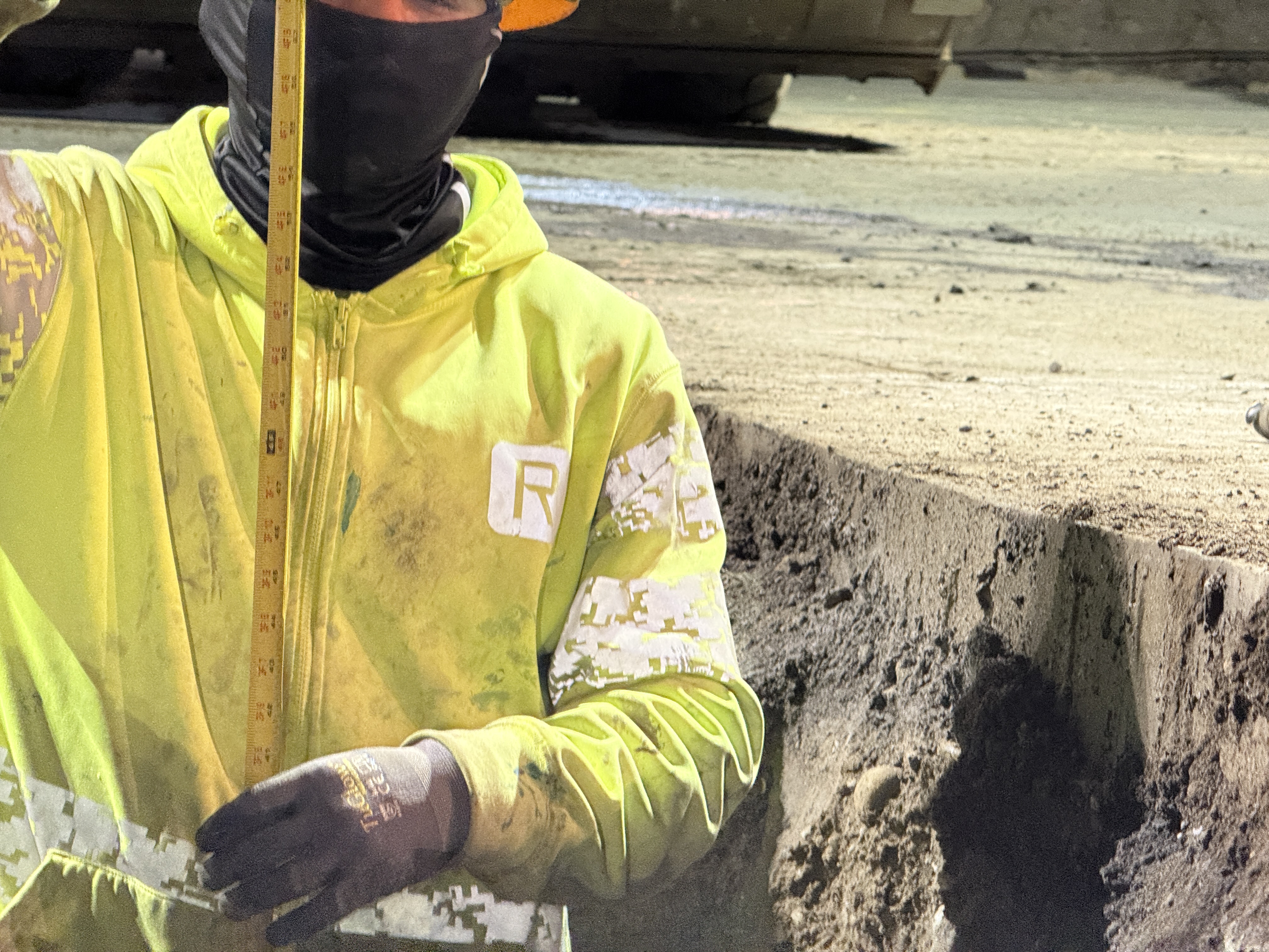 A construction worker is holding a measuring tape against the side of a freshly excavated trench, likely measuring the depth or soil profile. The trench shows clear stratification between compacted fill and subsoil, indicating recent digging activities. The worker is equipped with a high-visibility safety jacket, and the area appears to be part of an underground utility project, likely in its early excavation phase.