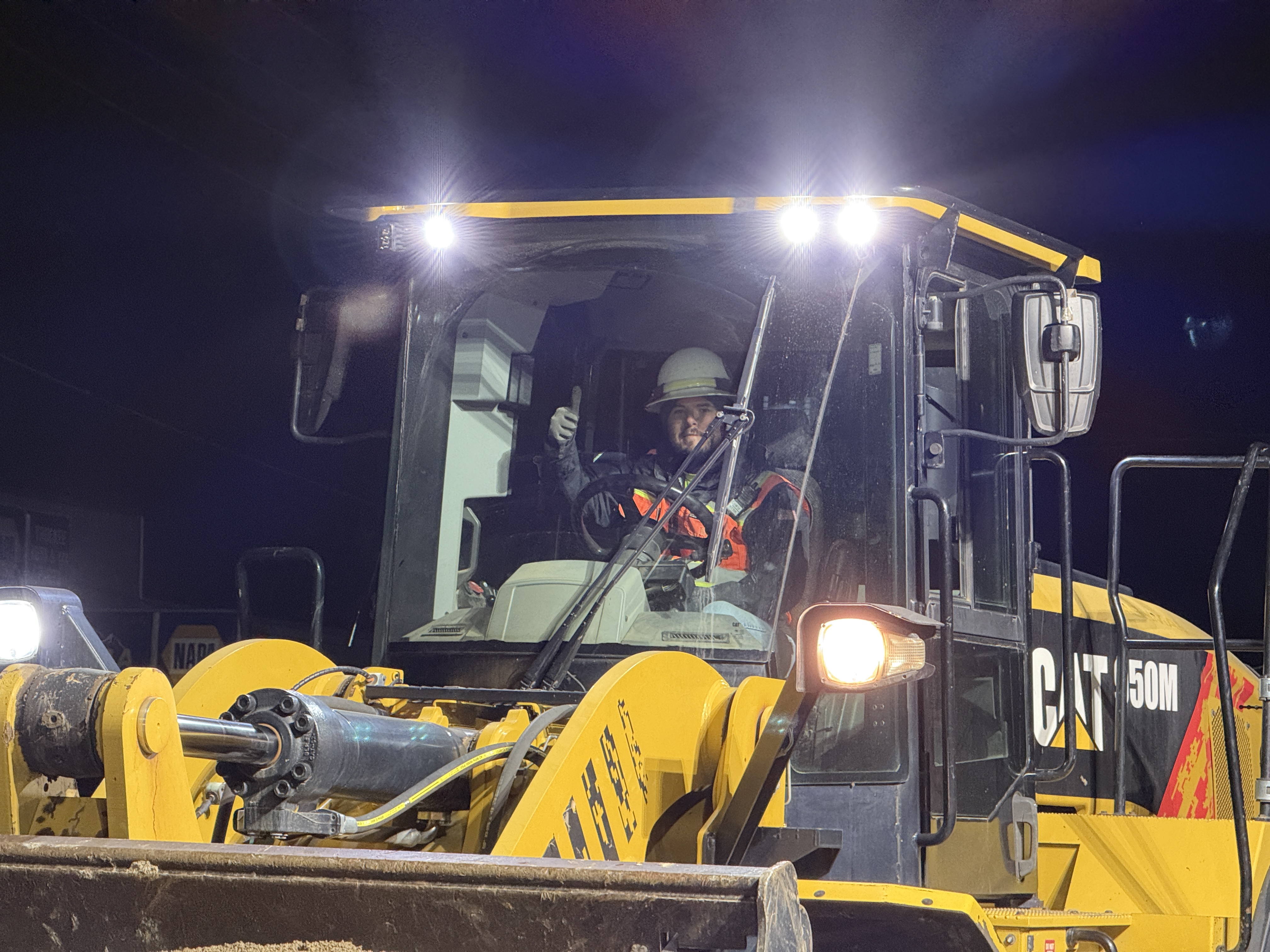 The image shows nighttime operation of heavy equipment active in the construction area. A worker is operating a CAT 950M wheel loader, indicated by the model visible on the machine, which is designed for material handling and heavy lifting tasks on site. The lighting suggests work is being conducted in low-light conditions with on-board lights providing necessary visibility.