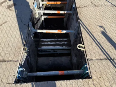 Mid-phase of construction with clear weather and good artificial lighting; trench is properly secured and prepared for inspection.