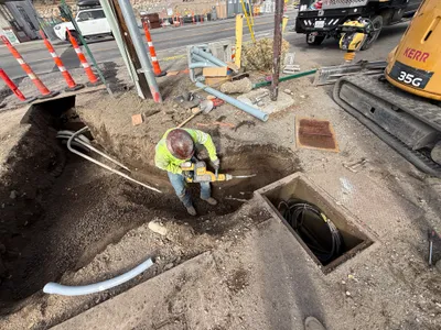 The photo shows construction workers inspecting a recently excavated trench on a construction site. The trench appears to be for underground utility installation, with some safety barricades around the site. The area looks clean and organized, indicating ongoing inspection or preparation for further activities.