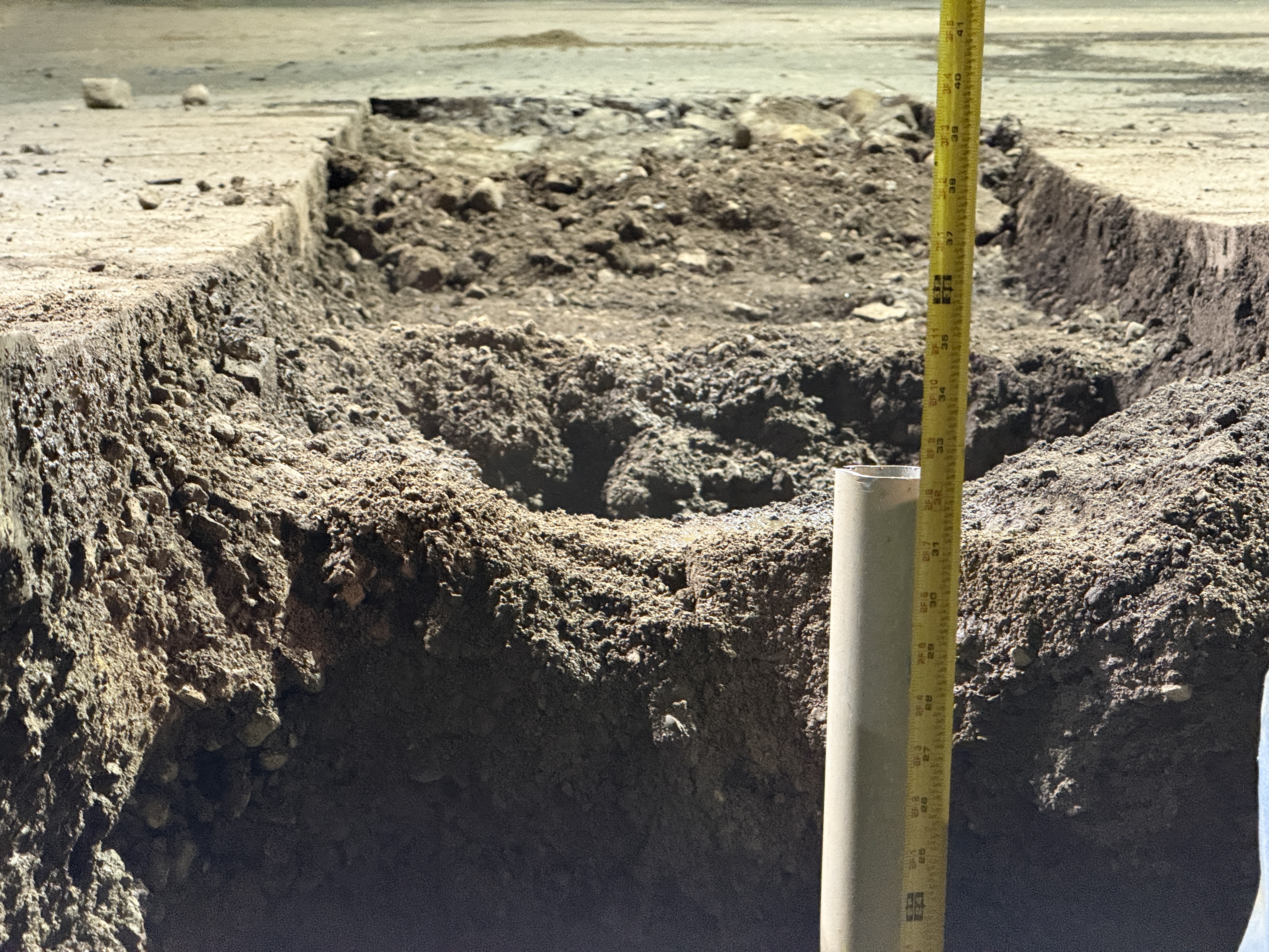 The photo shows a trench excavation likely for underground utility work. The soil appears compacted with rough surfaces. A measuring tape is visible, suggesting depth measurement activities. There is a vertical pipe partially inserted into the trench, indicating the initial stage of pipeline installation.