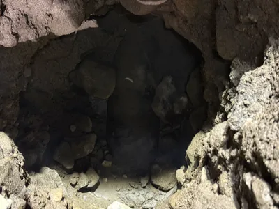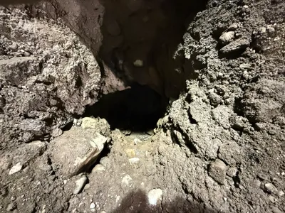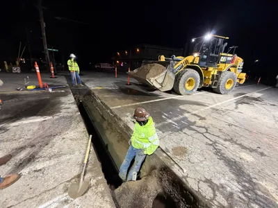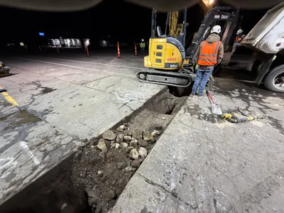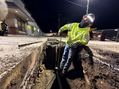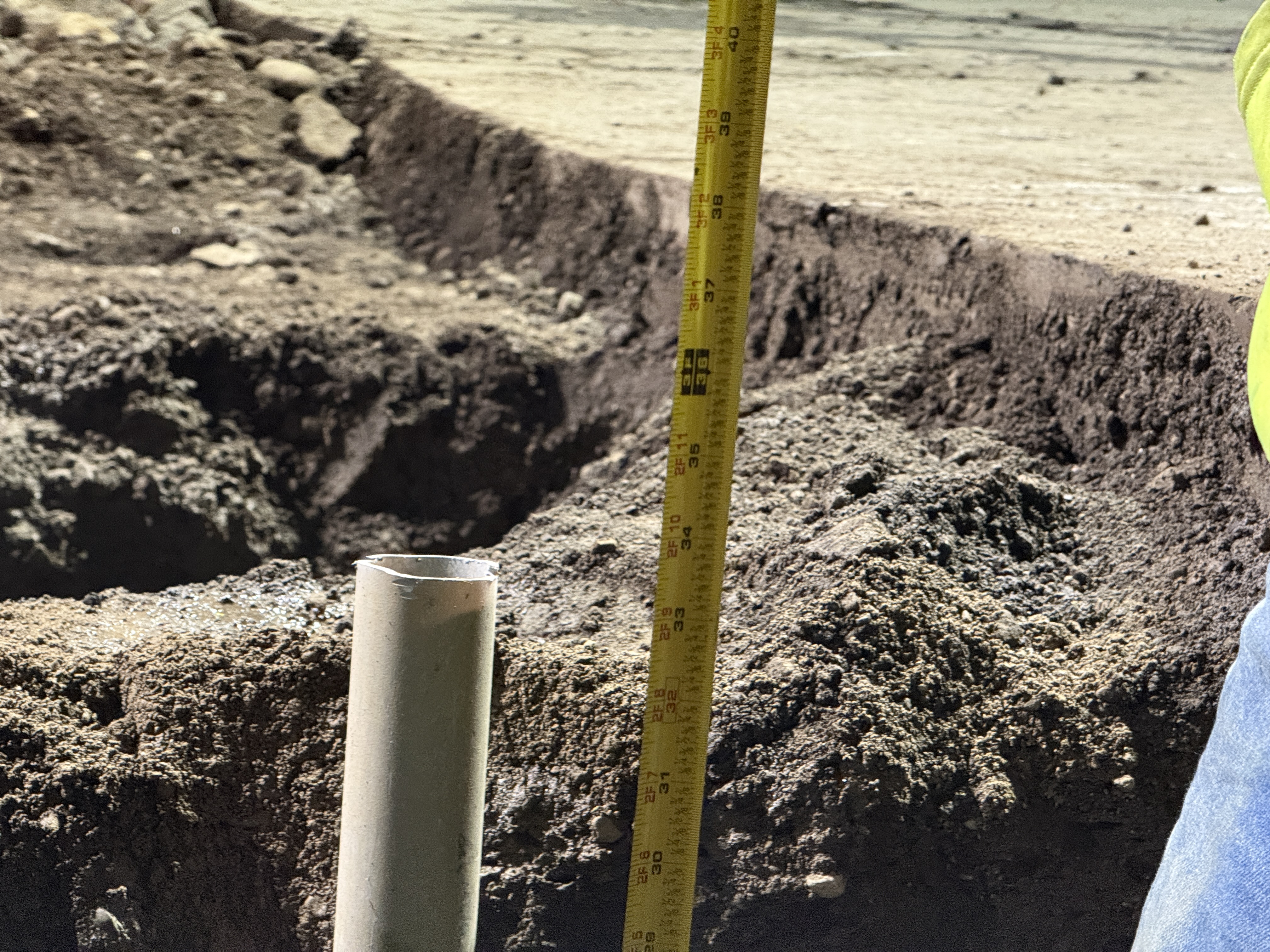 A trench has been excavated with a length of pipe visible, likely part of an underground utility installation project. A measuring tape is being used to check the depth or alignment of the trench. The construction stage appears to be in progress with exposed earth and no backfill yet applied.
