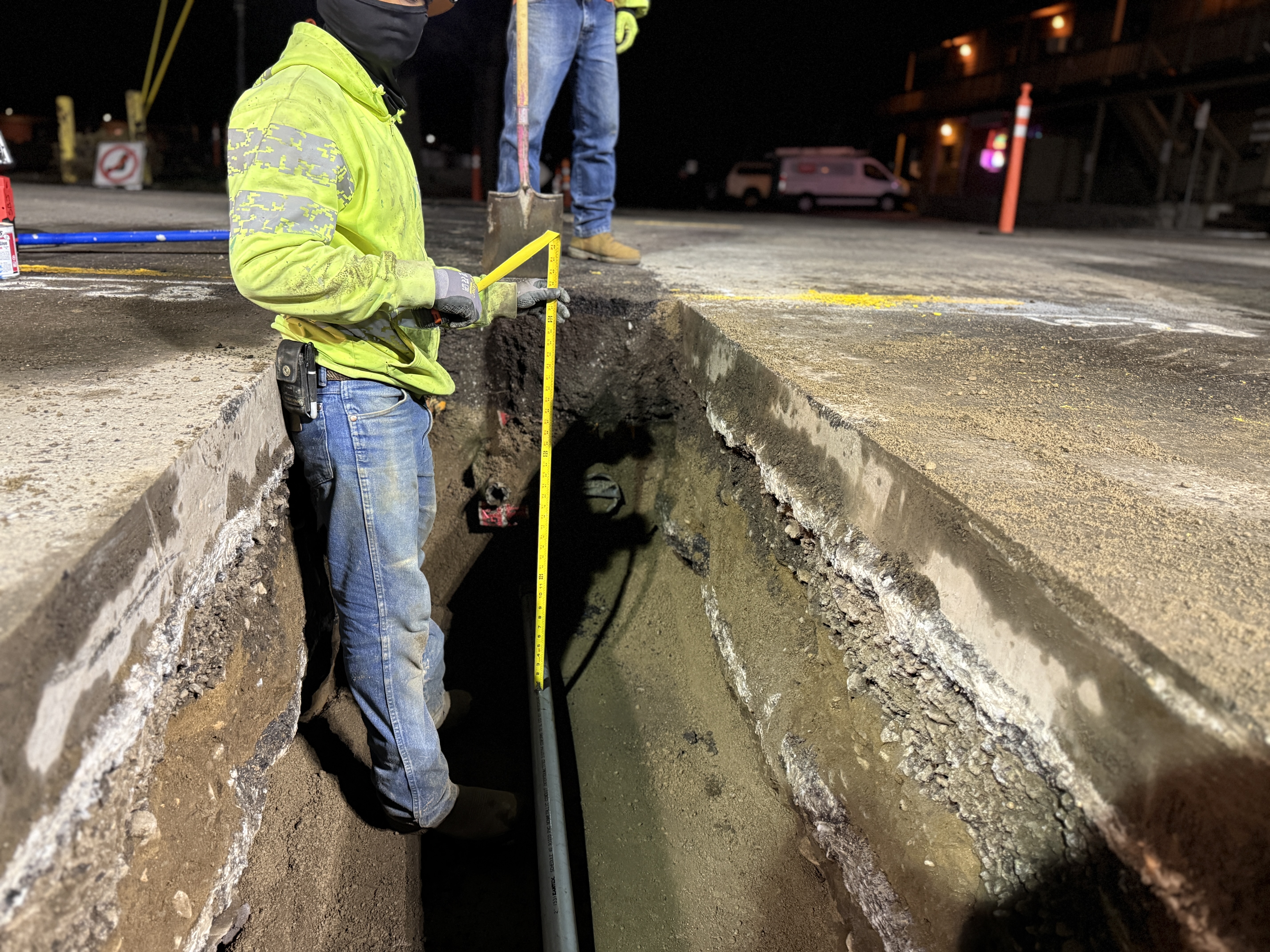 The photo shows a construction worker measuring the depth of a trench where a pipeline installation is underway. The trench is already dug out with soil layers visible, and a segment of pipe, likely made of PVC or similar material, is laid at the bottom. The activity represents an ongoing stage of pipeline installation, possibly early to mid-phase of construction.
