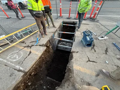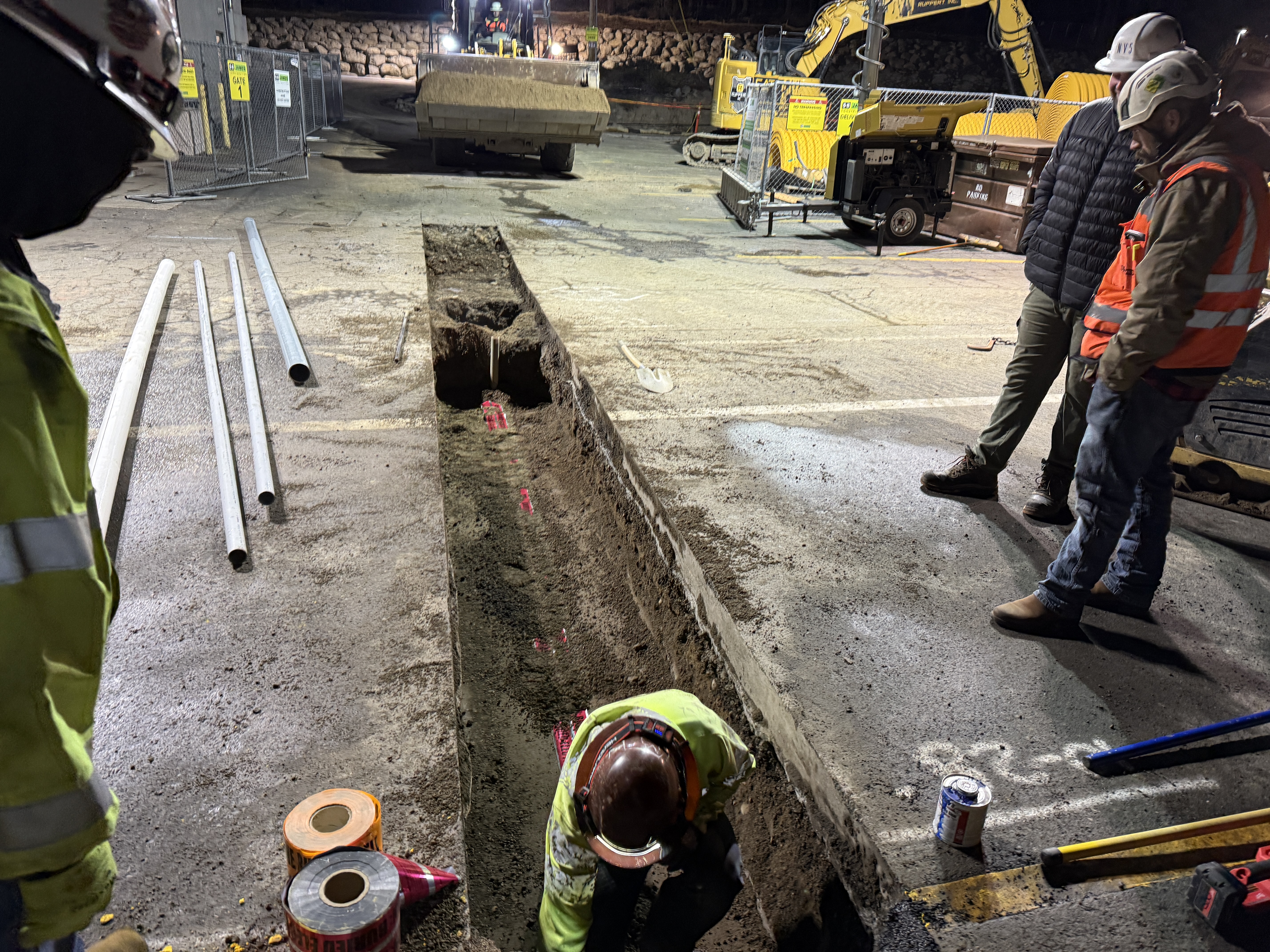 The image shows construction workers engaged in trench excavation and inspection activities at an active water infrastructure project site. Multiple pipes are prepared for installation alongside the trench, which appears to be in an initial excavation phase. Heavy machinery such as an excavator and a loader are present, indicating material handling tasks. The site is well-lit, suggesting night work or early morning operations.