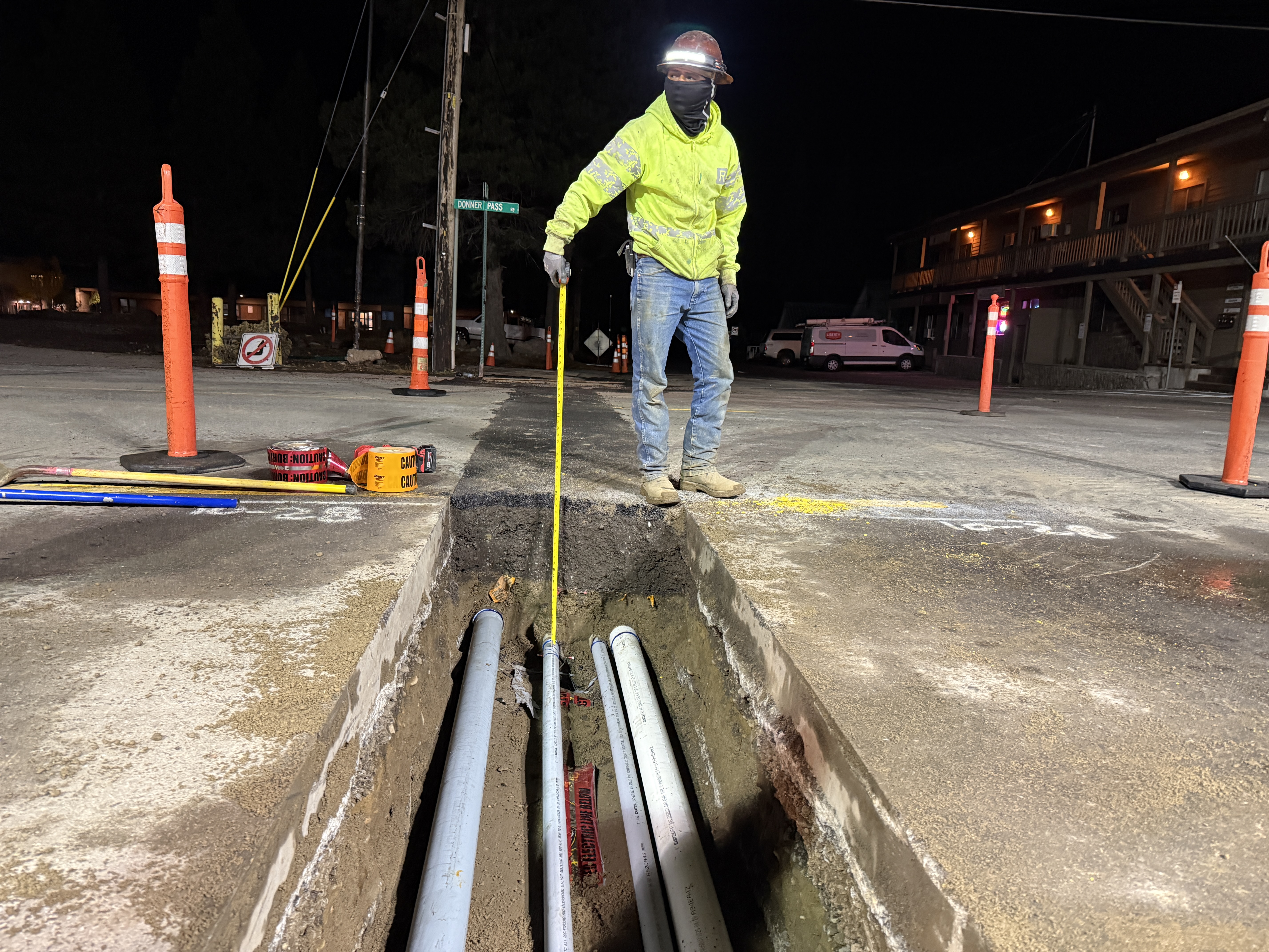 The photo shows a construction worker measuring inside a trench containing multiple installed conduits. The worker is using a tape measure to ensure the depth or position of the conduits, which appear to be part of an underground utility installation. The surrounding area is prepared for nighttime work, indicated by the presence of safety lighting and signage.