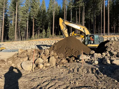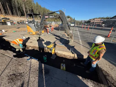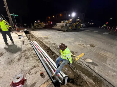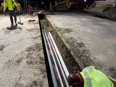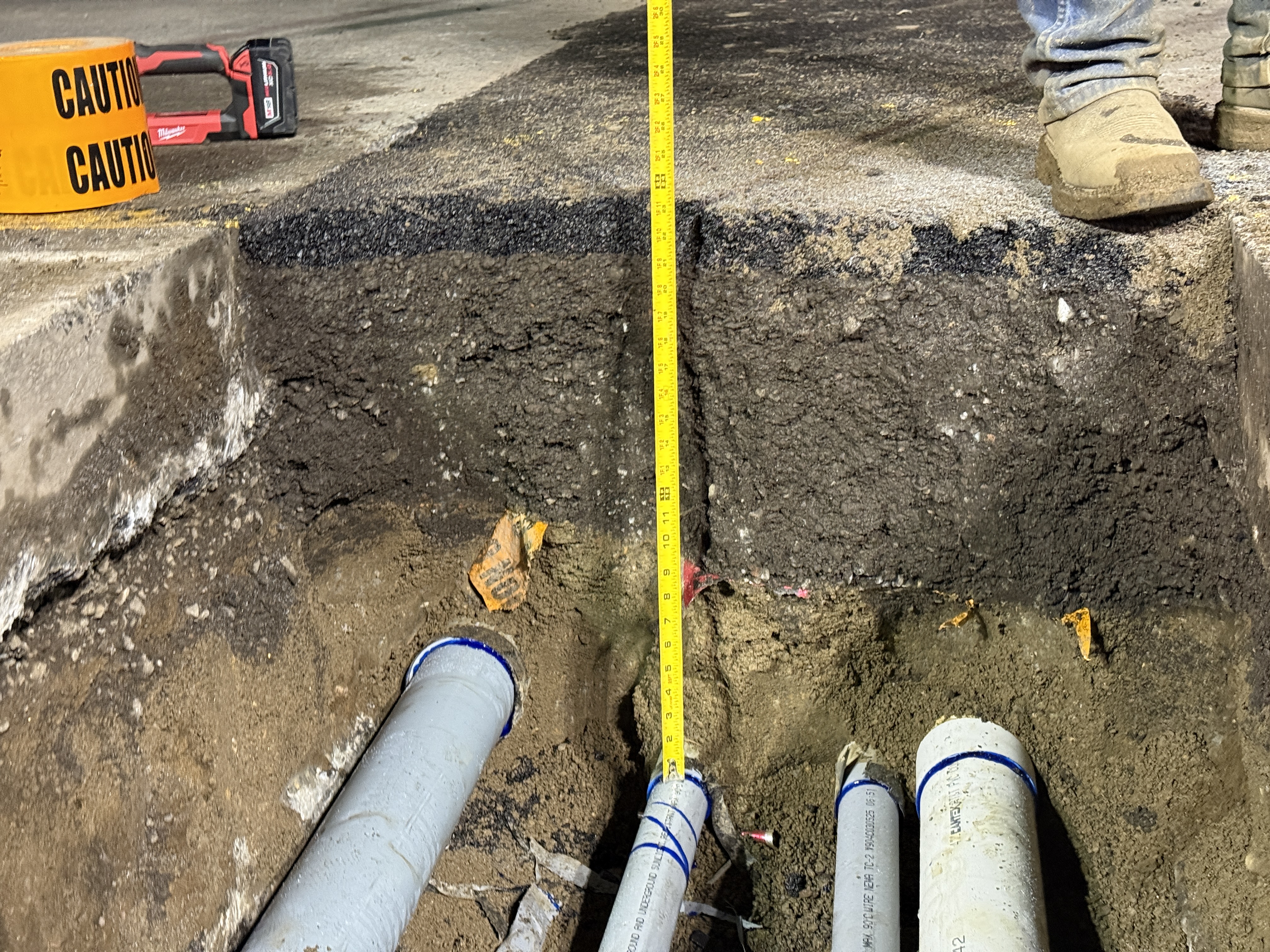 The photo shows an open trench with several PVC pipes partially installed and exposed. A measuring tape is placed vertically to gauge the depth of the trench, indicating ongoing measurement or inspection activities. The surrounding surface is asphalt, and a roll of caution tape suggests that safety measures are being taken to secure the area. Visible soil layers indicate recent excavation work.
