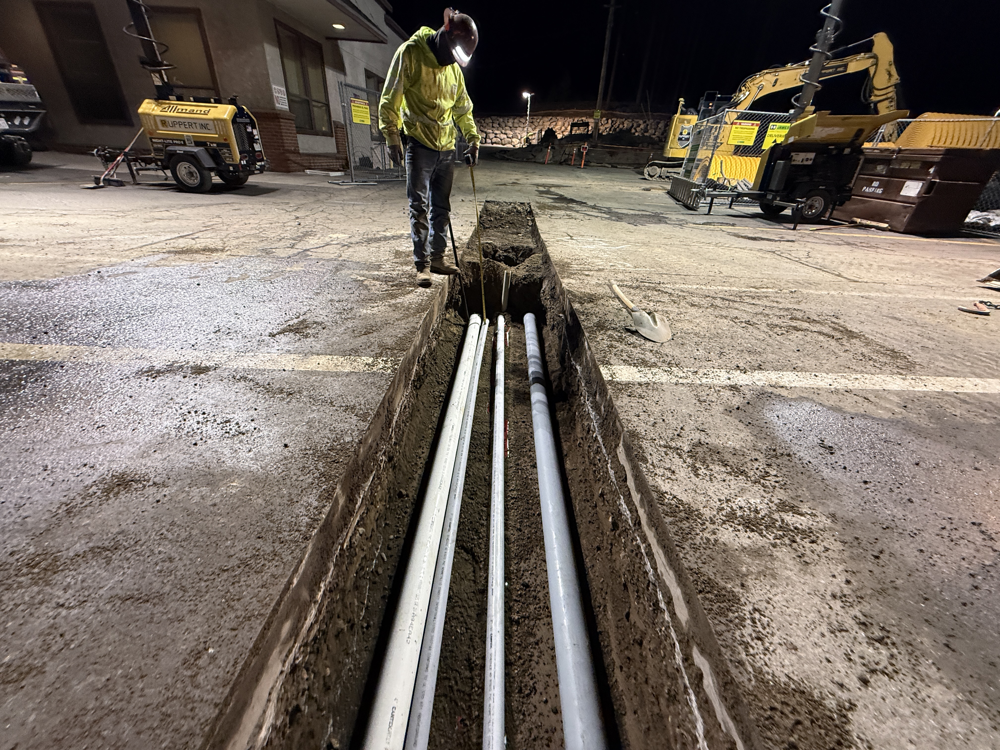 Mid-phase construction at night with trench excavation in progress; the ground consists of asphalt and soil with artificial lighting.