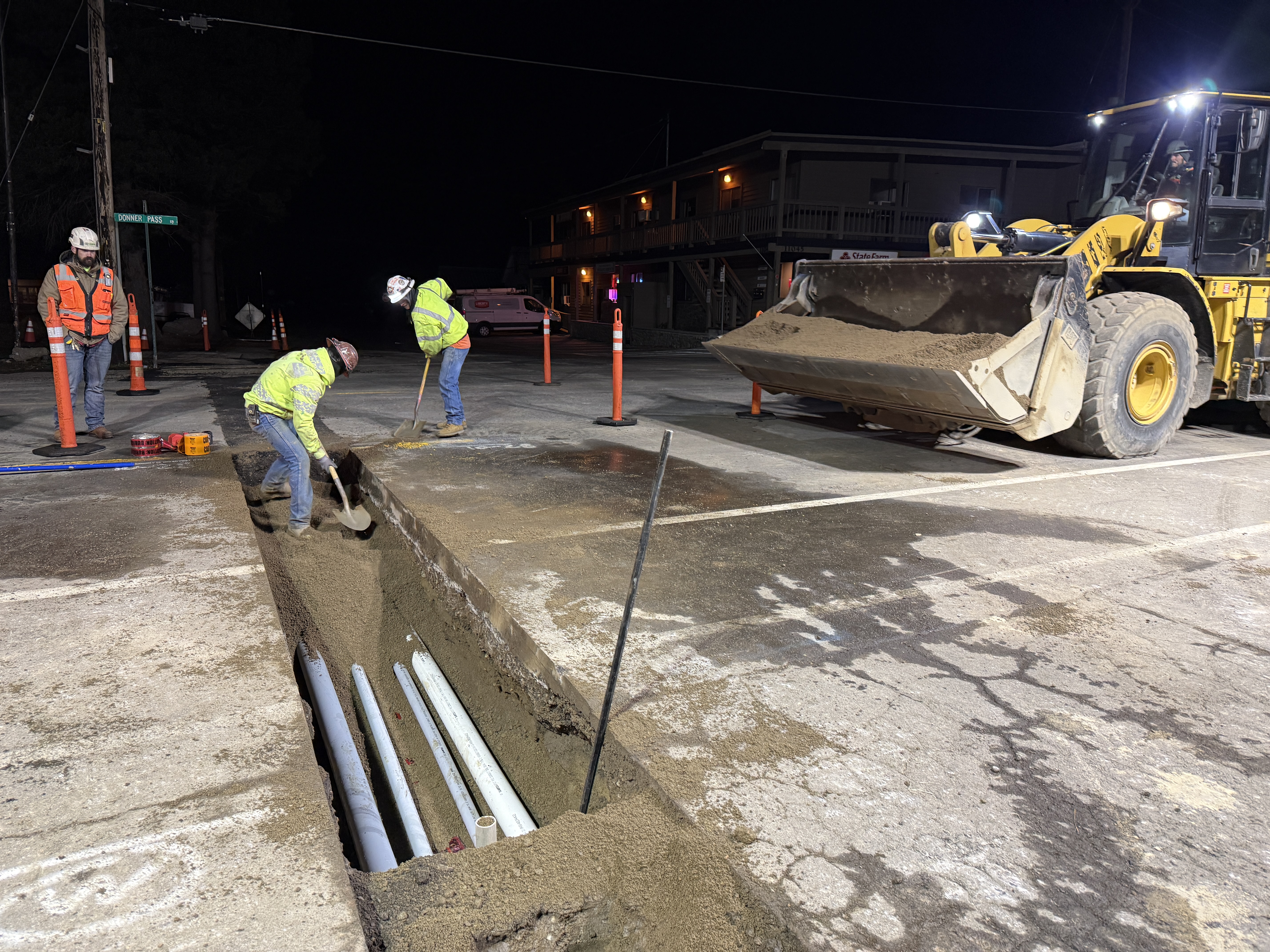 The photo depicts workers engaged in backfilling a trench with sand using hand tools and a loader. Several white PVC pipes are laid within the trench, indicating the installation of underground utilities. The site is in the mid-construction phase, taking place at night under artificial lighting. Safety barriers and cones are set up around the work area.