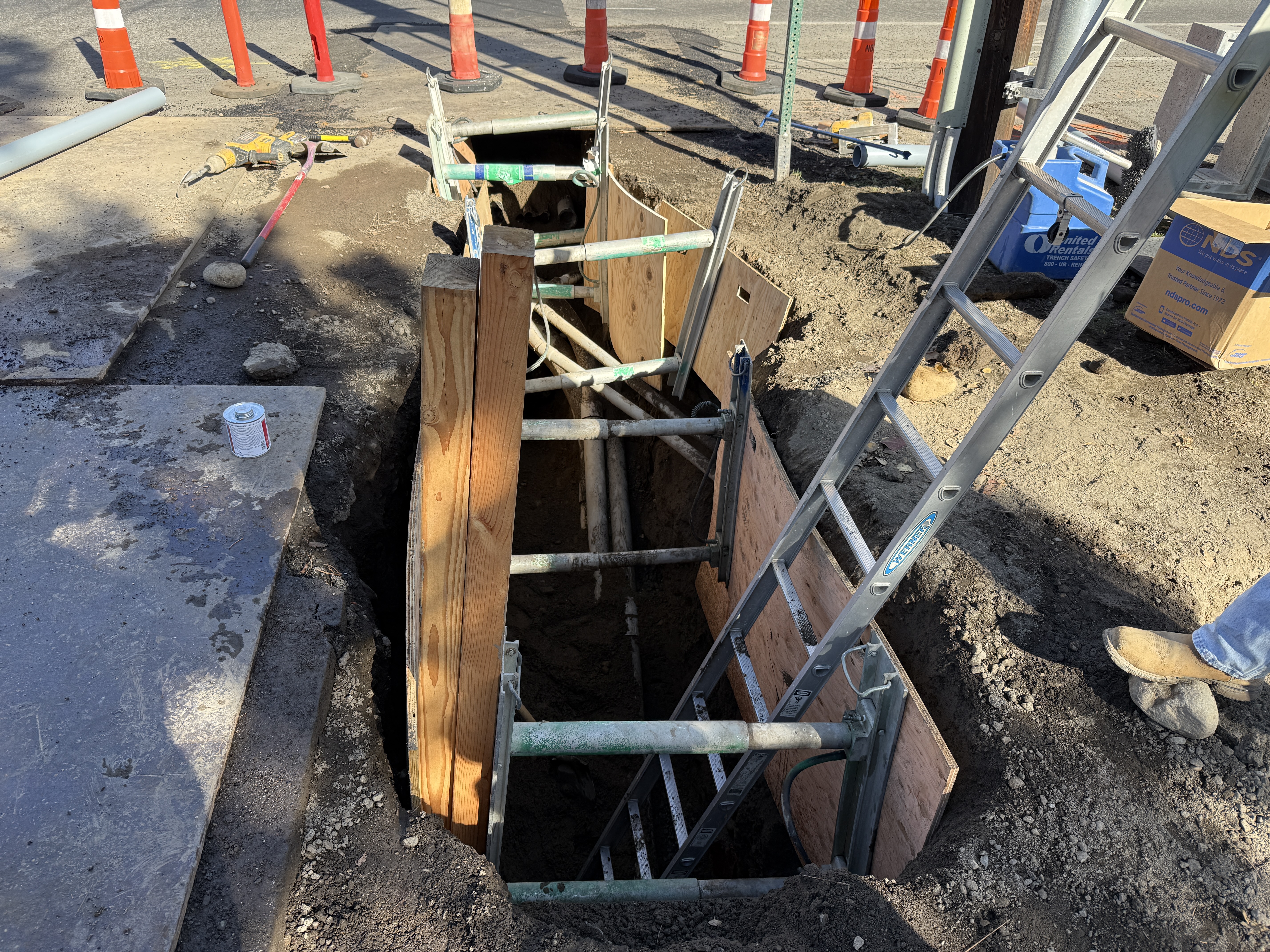 The photo depicts an excavated trench with internal wooden and metal supports on a construction site, likely for utility installation. A ladder provides access to the trench, and traffic cones are visible indicating road safety measures. The setup suggests mid-phase trench shoring with plywood used for retaining soil.