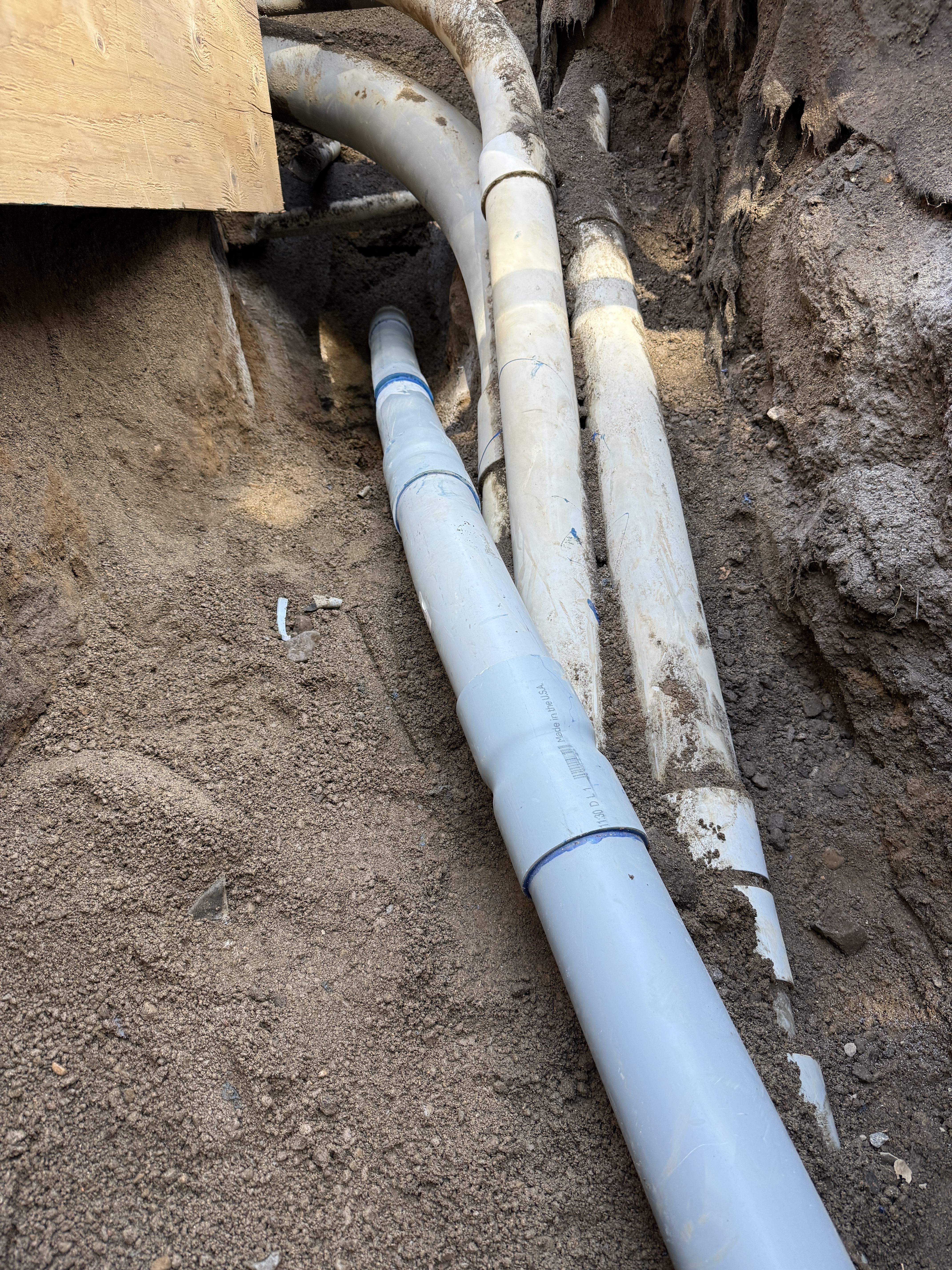 The image shows a trench containing multiple PVC pipes likely for water infrastructure, with one prominently in the foreground indicating ongoing pipeline installation. The pipes appear joined with couplers, indicating the connection phase. The trench is partially backfilled with dirt, suggesting mid-stage construction activities.