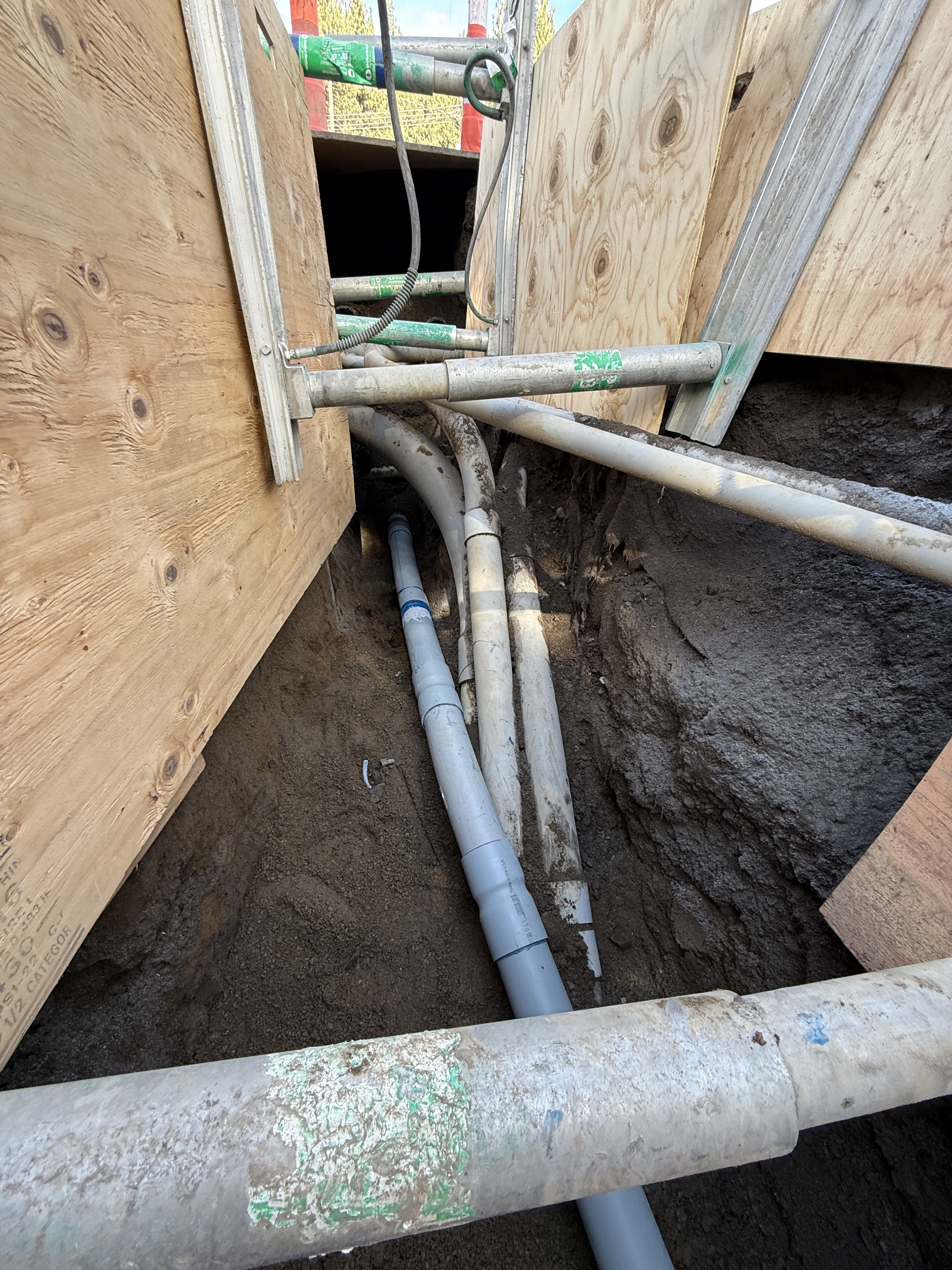 The photo shows an active construction site with multiple PVC conduits installed in a trench, supported by wooden shoring. The trench is secured with plywood and metal bracing. The plumbing work involves routing the pipes underground, possibly for water or electrical utilities, and is likely in mid-installation given the exposed pipes and open trench.