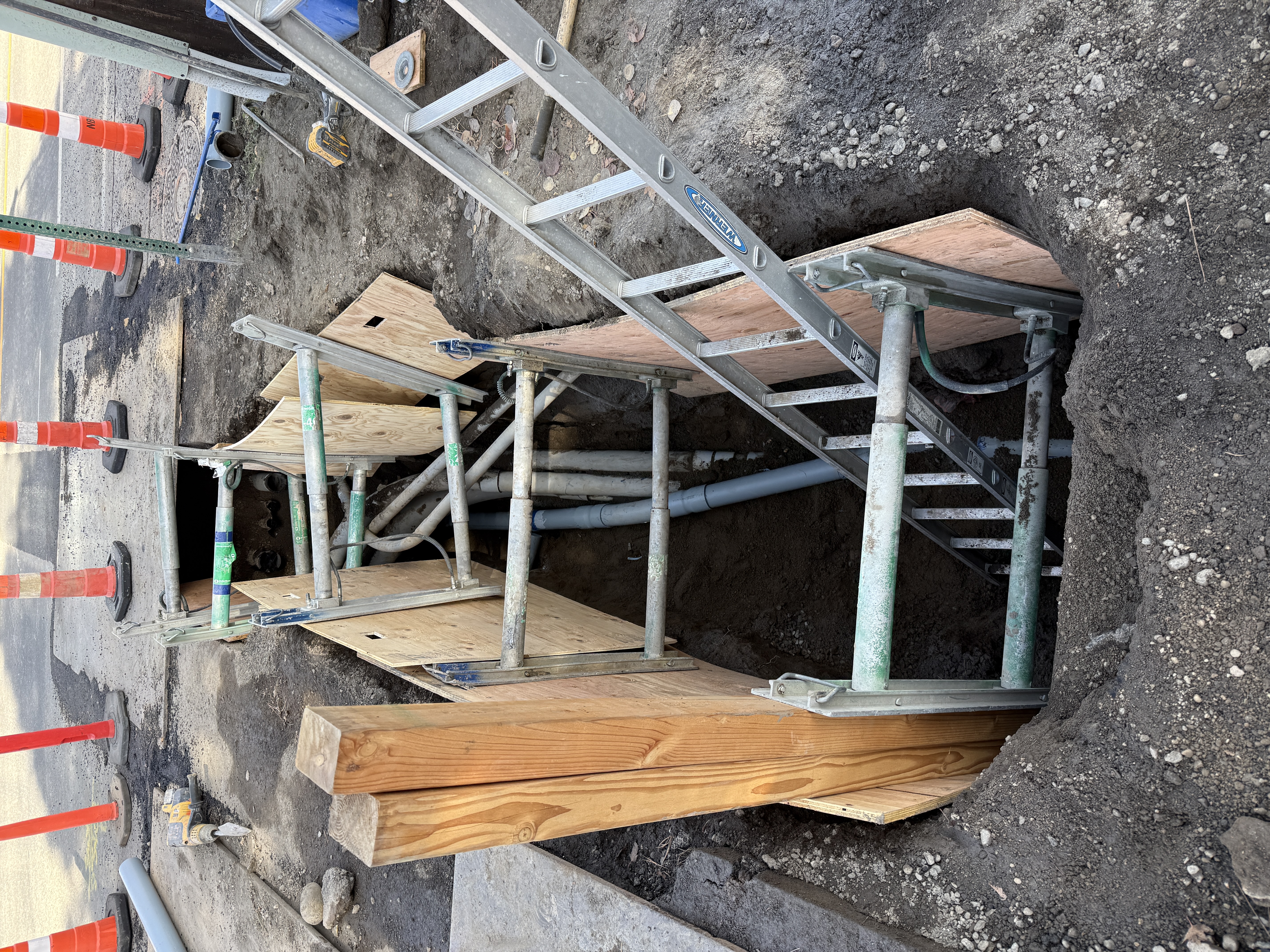 The photo shows an open trench with timber shoring and metal cross braces for stabilization. Several PVC pipes of varying diameters are visible, suggesting ongoing underground utility installation. A ladder provides access to the trench, indicating work in progress. Traffic cones are positioned around the site, signifying active construction near a roadway.