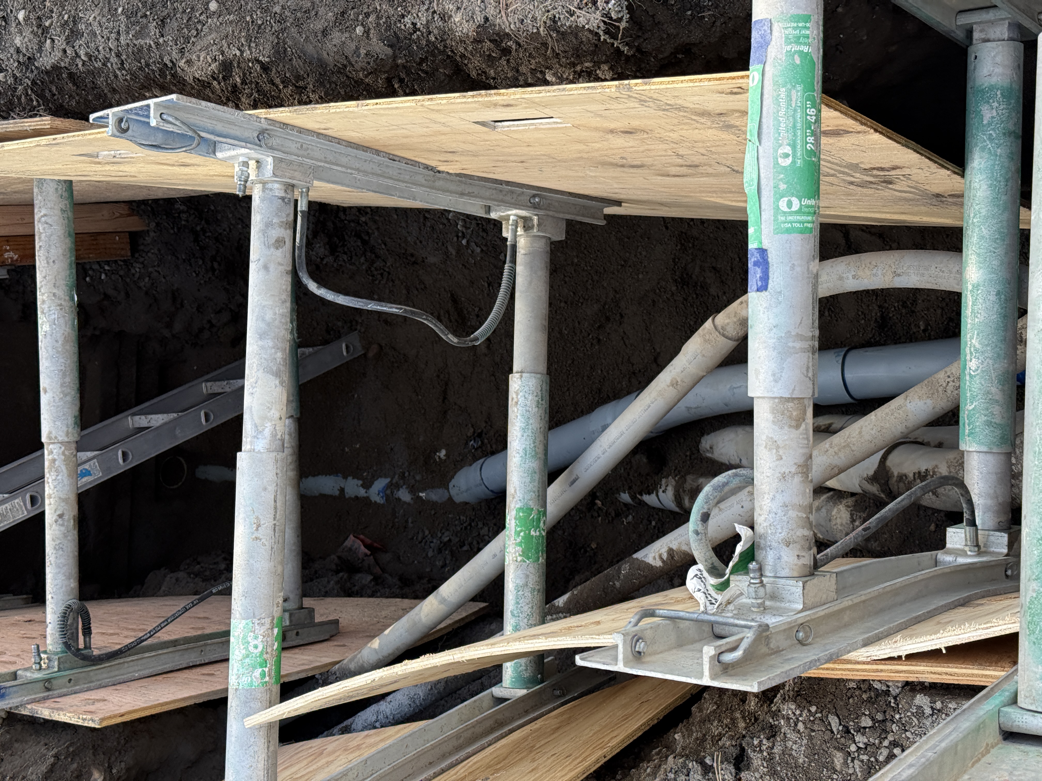 The image shows a trench excavation with shoring in place, indicating active underground utility work. Several conduits and pipes are visible, presumably for water infrastructure, with soil backfill partially covering them. The shoring ensures trench stability, highlighting a mid-phase construction stage focused on pipeline installation.