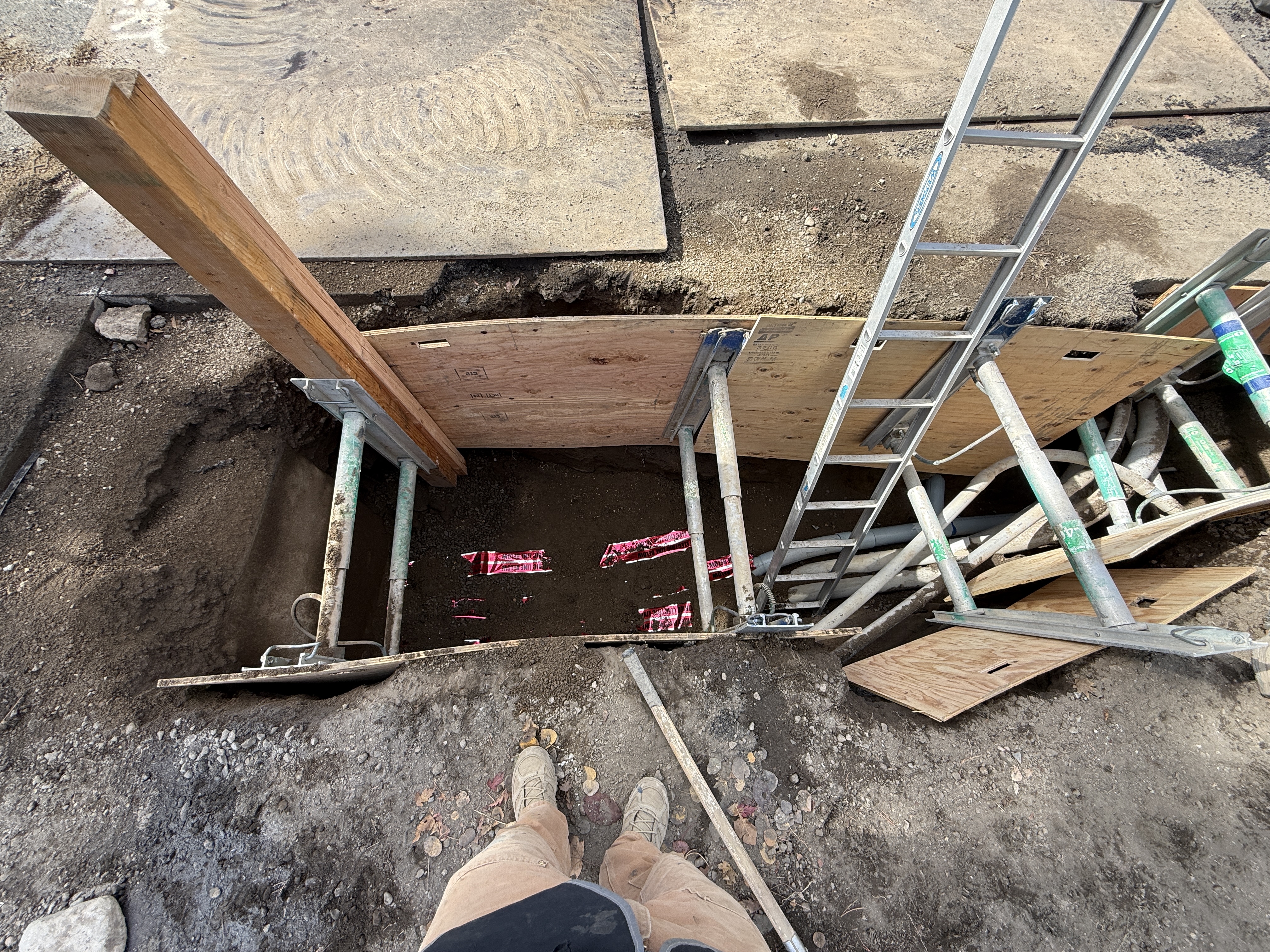 The image shows an active trench excavation for underground utility installation. Shoring equipment supports the trench walls, which are lined with plywood for stabilization. A metal ladder provides access to the trench, and various pipes are visible, indicating ongoing pipeline work. Temporary wooden and metal structures suggest the trench is being prepared for further construction activities.
