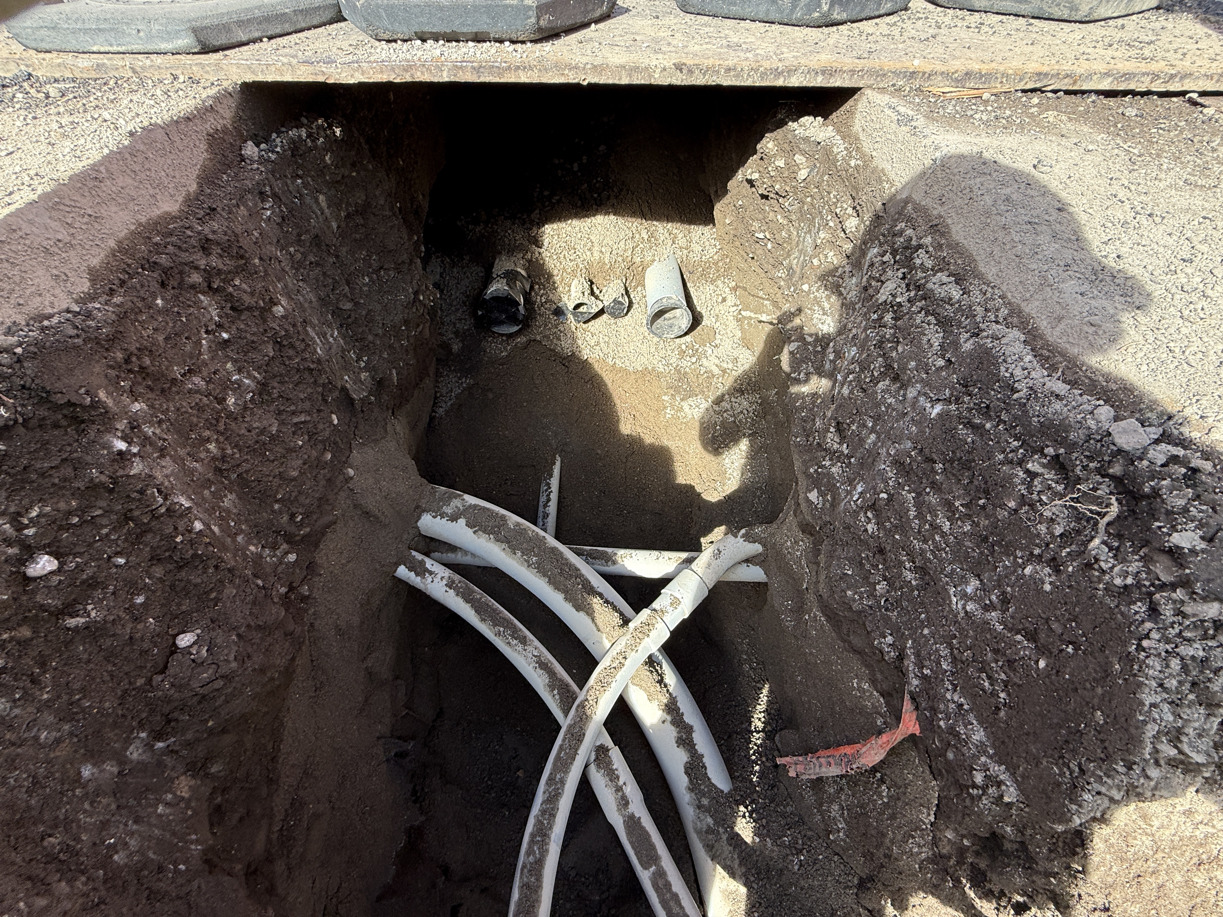 The photo shows a section of trench excavation with several white PVC pipes either installed or pending connection. The exposed ends of the PVC conduits indicate work in progress at the underground utility installation stage. The trenches are dug into compacted soil, showing structural stability but no visible shoring or support by excavation safety standards.