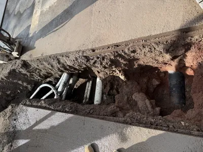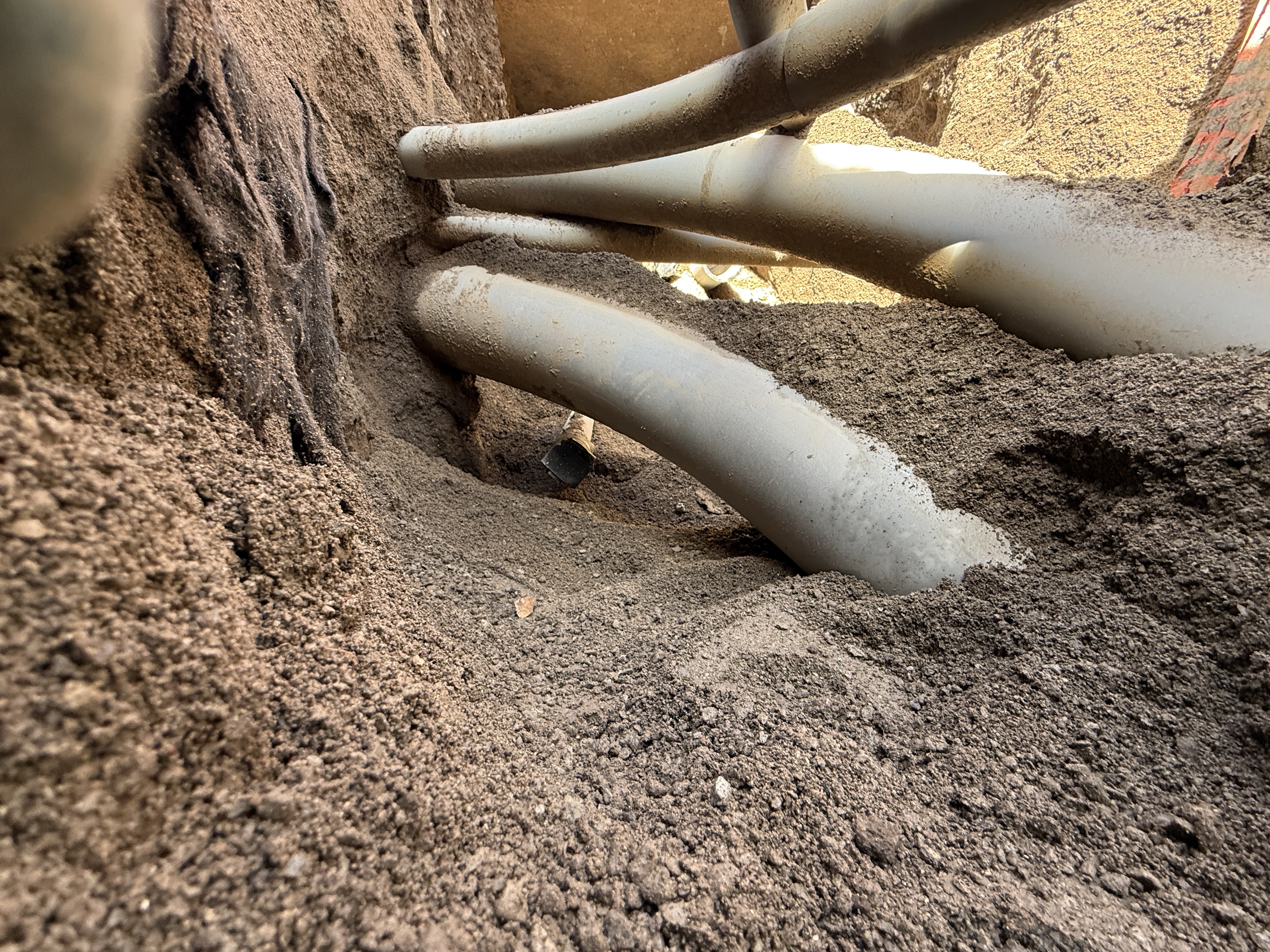 The photo shows multiple large conduits being laid in an excavated trench. These conduits are likely utility conduits for water or other infrastructure services. The conduits appear to be placed in a carefully prepared trench, partially backfilled with soil. The stage of construction is active pipeline-installation in an underground setting.