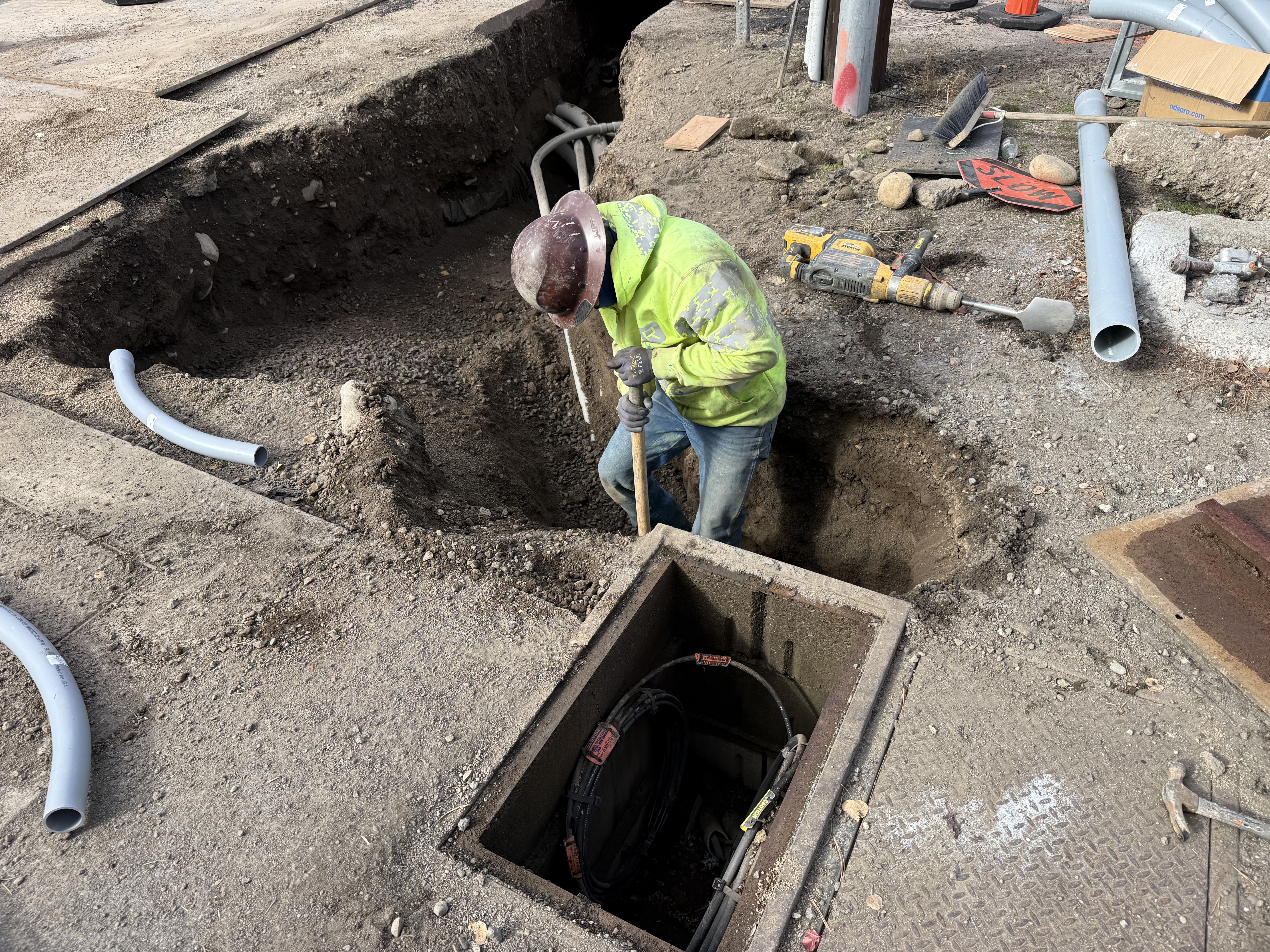 The image shows a construction worker engaged in underground utility work, possibly involving pipeline installation. The worker is using a shovel to excavate soil, and multiple PVC pipes are laid out in and around the trench. An open utility vault is visible, containing cables and a meter box. The site appears to be in a trench excavation phase, with various plumbing and electrical components staged nearby.