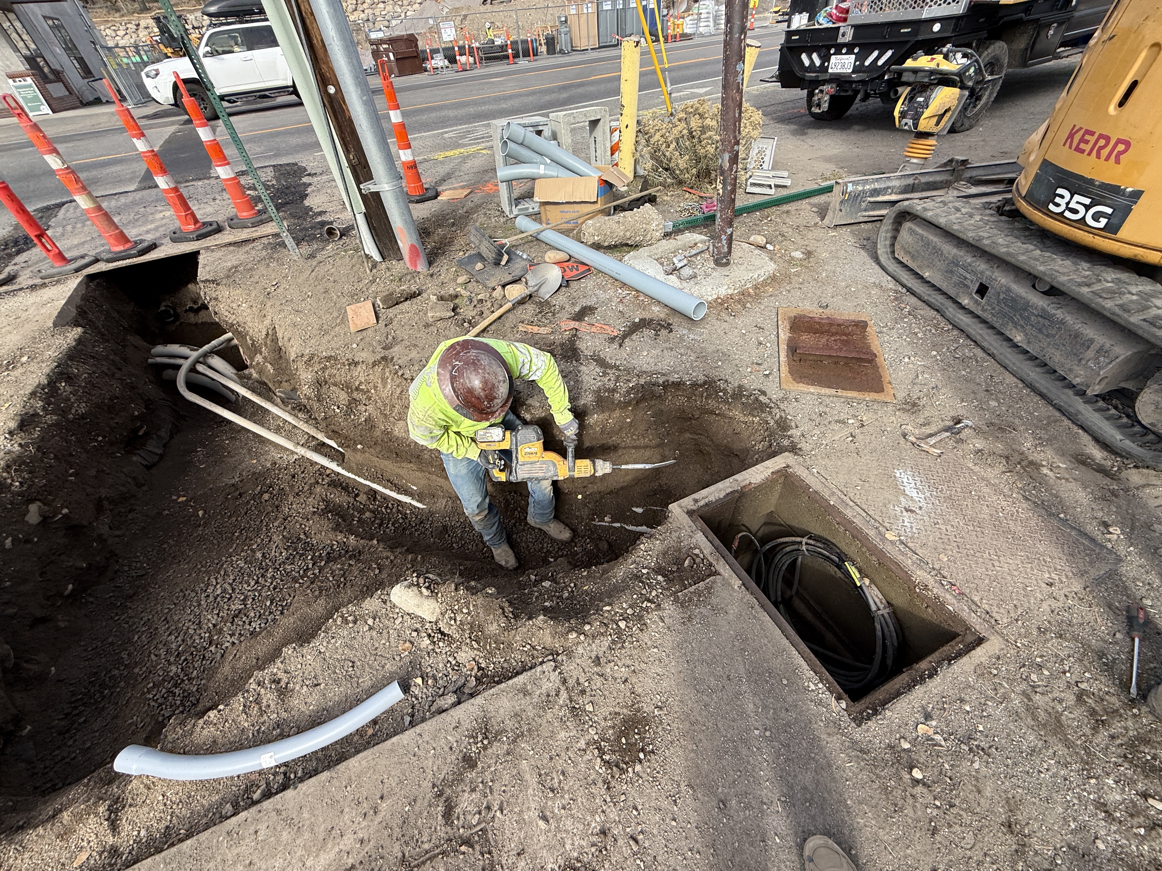 The image shows a construction worker using a hammer drill inside a trench, working on underground utility infrastructure. Various PVC pipes are exposed, likely for water or electrical conduits, and an excavator is stationed nearby suggesting active excavation or backfilling. The trench is part of an ongoing utility installation project, and there are utility access ports visible, indicating mid-stage construction.
