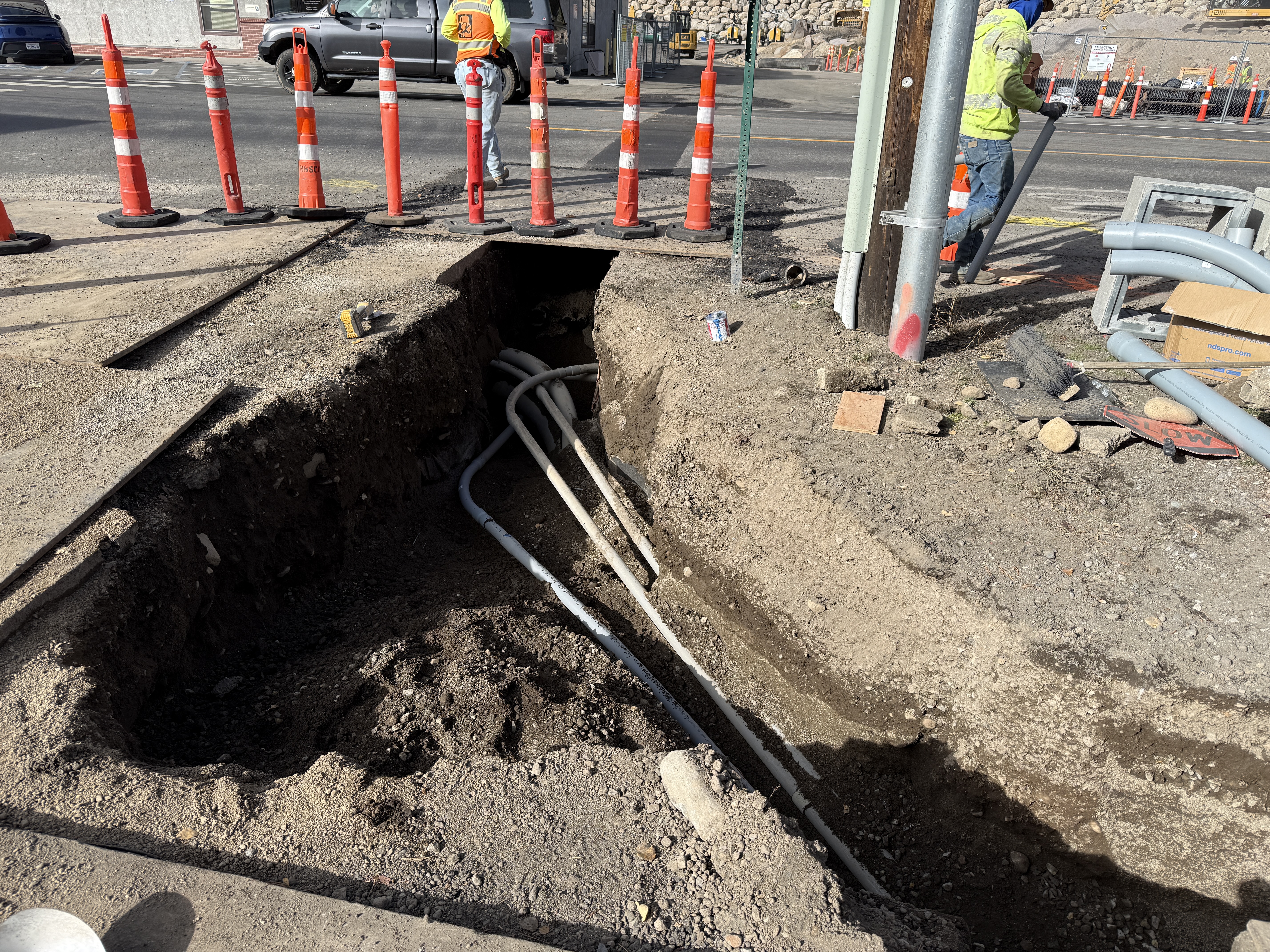 The image shows a trench excavation in progress for underground utility work, with multiple plastic conduits visible being placed or adjusted. Workers are present near the site, handling materials, possibly related to electrical conduit installation. The area is surrounded by a series of safety cones indicating pedestrian and vehicular restrictions.