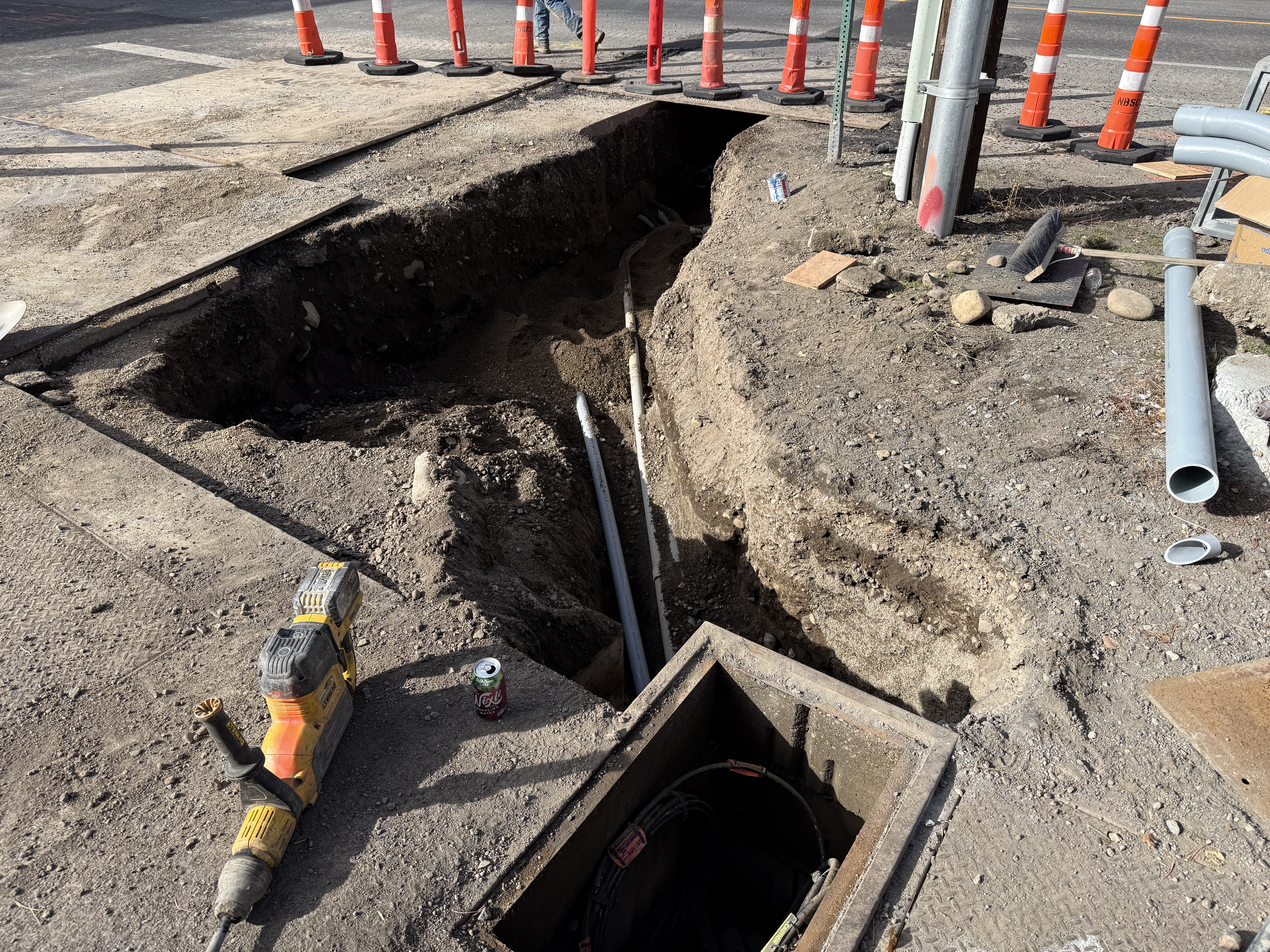 The photo shows an open trench excavation with visible electrical conduits being installed. There are orange safety cones used to demarcate the construction area, indicating active work. A power drill is present next to the trench, suggesting ongoing or recent conduit installation work.