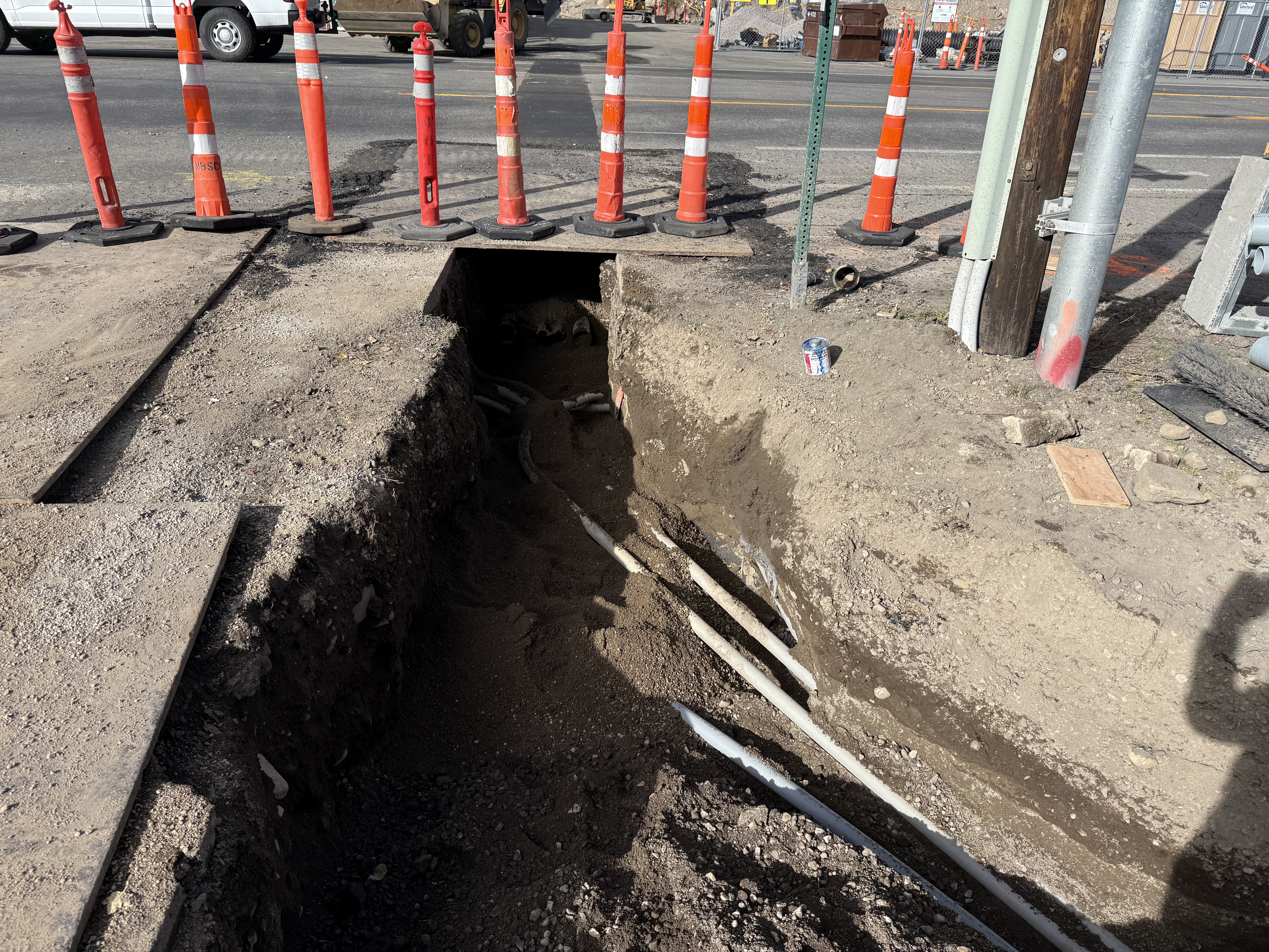 The image shows a partially excavated trench on a roadside, with several conduits placed within the trench. The trench is surrounded by orange safety cones indicating active work. It appears that the conduits are for utility installations, likely in early stages of underground utility work.