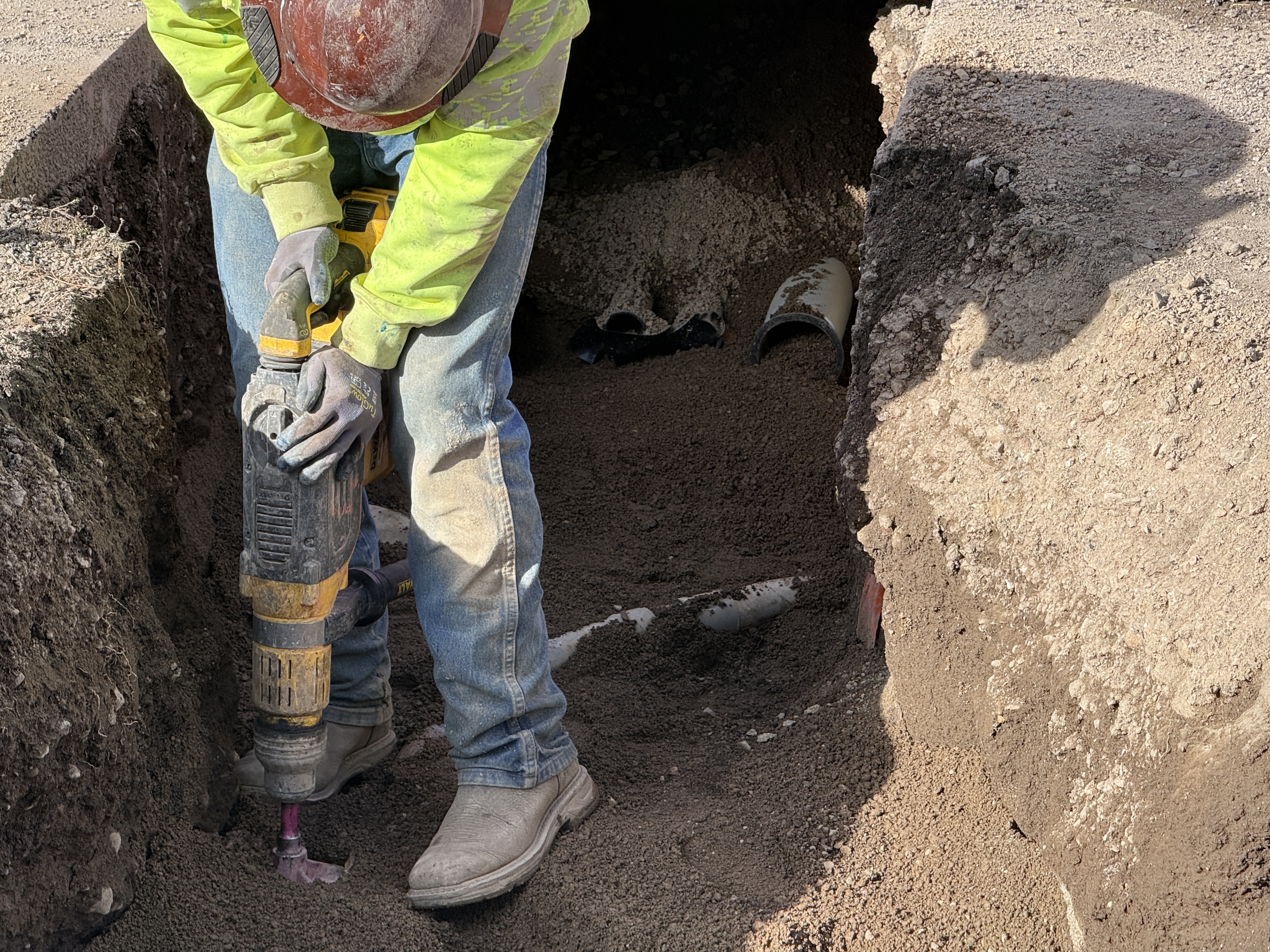 A construction worker is using a cordless rotary hammer to drill into the ground within a partially excavated trench. The worker is situated atop loose backfill material, and partially visible PVC pipes indicate that underground utility work is in progress. The trench appears to be in the backfilling stage, and some existing infrastructure is visible in the excavation.