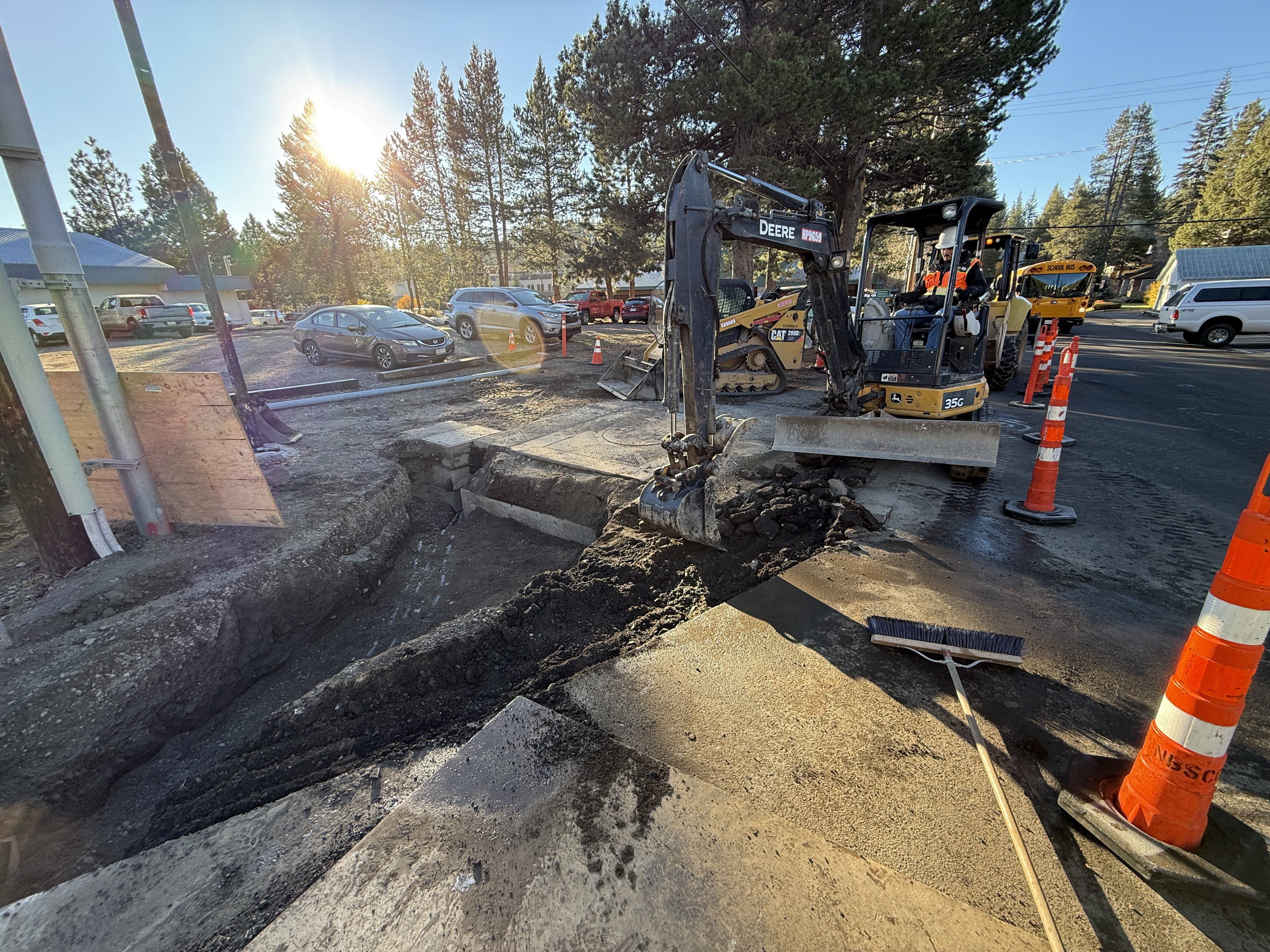 The photo shows ongoing trench excavation using a John Deere 35C mini excavator. The trench appears to be prepared for utility installation, possibly for underground piping. Concrete surfaces are partially cut, and the area is marked with traffic cones for safety. A broom is lying on the pavement, indicating site cleanup or preparation for backfill.
