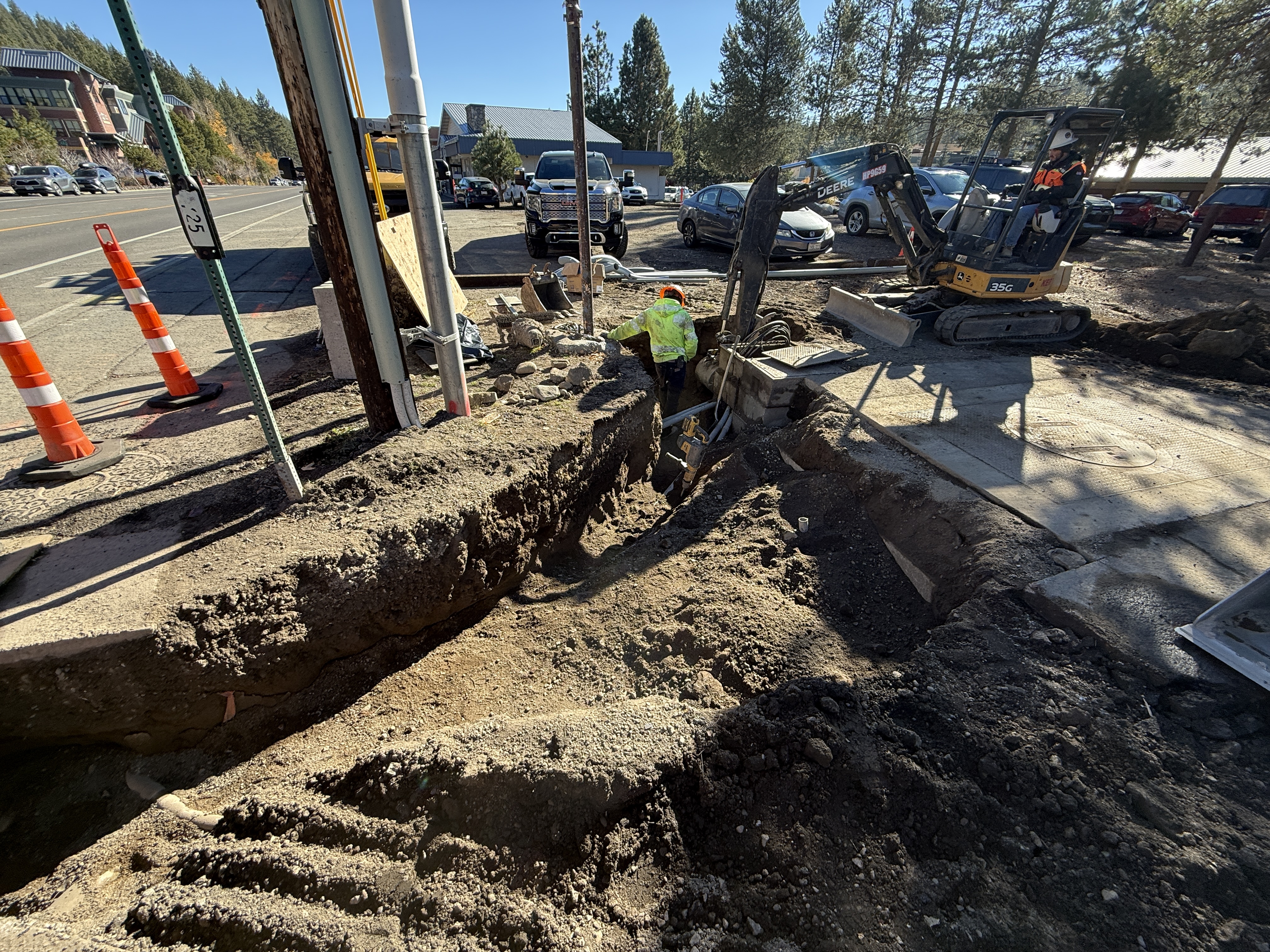 The image shows an active construction site where a trench excavation is in progress alongside a road. A worker in high-visibility clothing is inside the trench, performing tasks likely related to pipeline or conduit installation. A compact excavator is positioned adjacent to the trench, indicating ongoing digging or backfilling activities. The site is in the early construction stage with exposed soil and dirt piles nearby.
