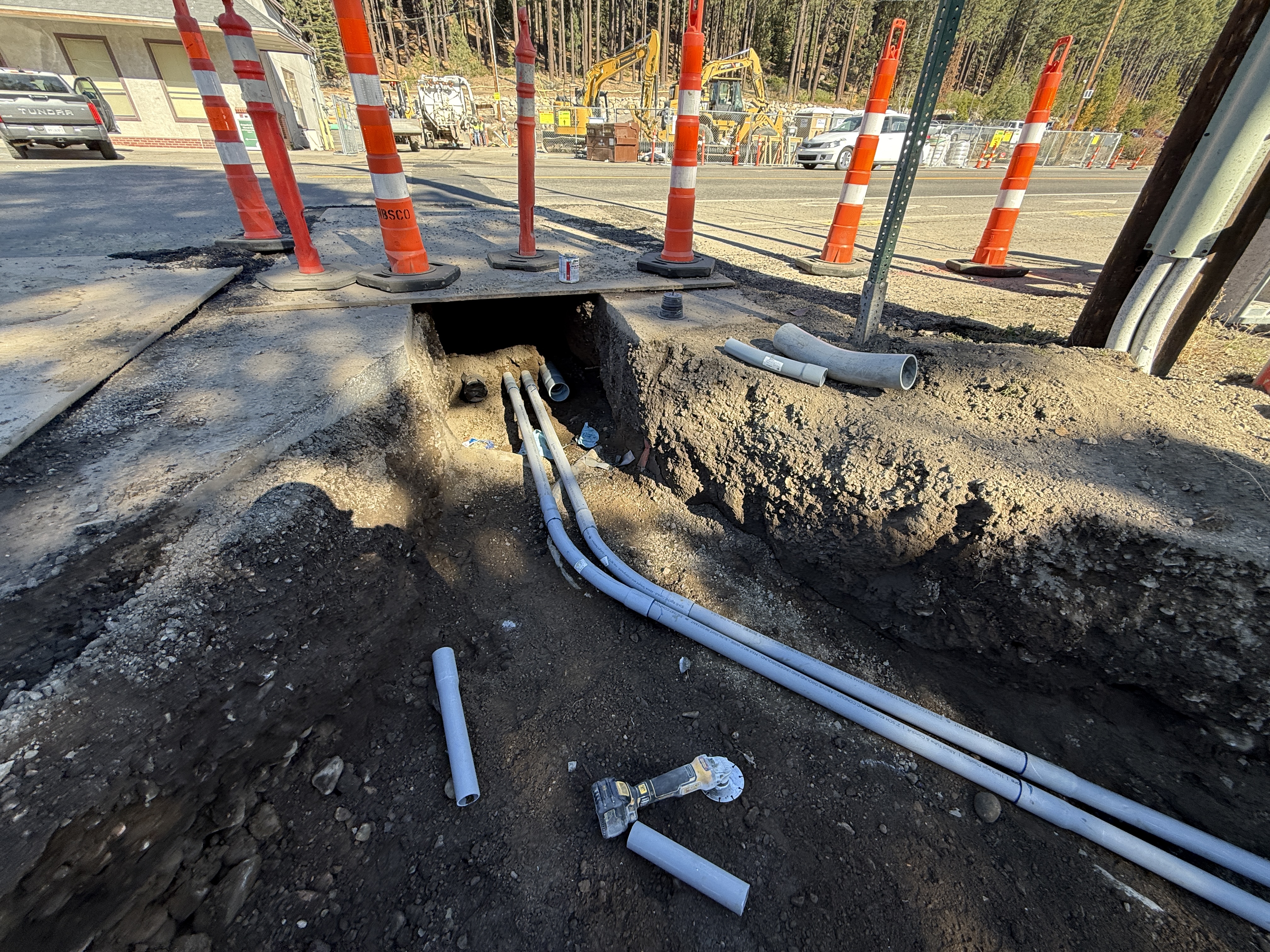 The photo shows an open trench with several white PVC electrical conduits being installed. The trench suggests the project is in the pipeline installation phase. Additional pipe materials and couplings are placed around the trench, indicating ongoing construction work. Traffic delineators are placed around the work area for safety and traffic control.