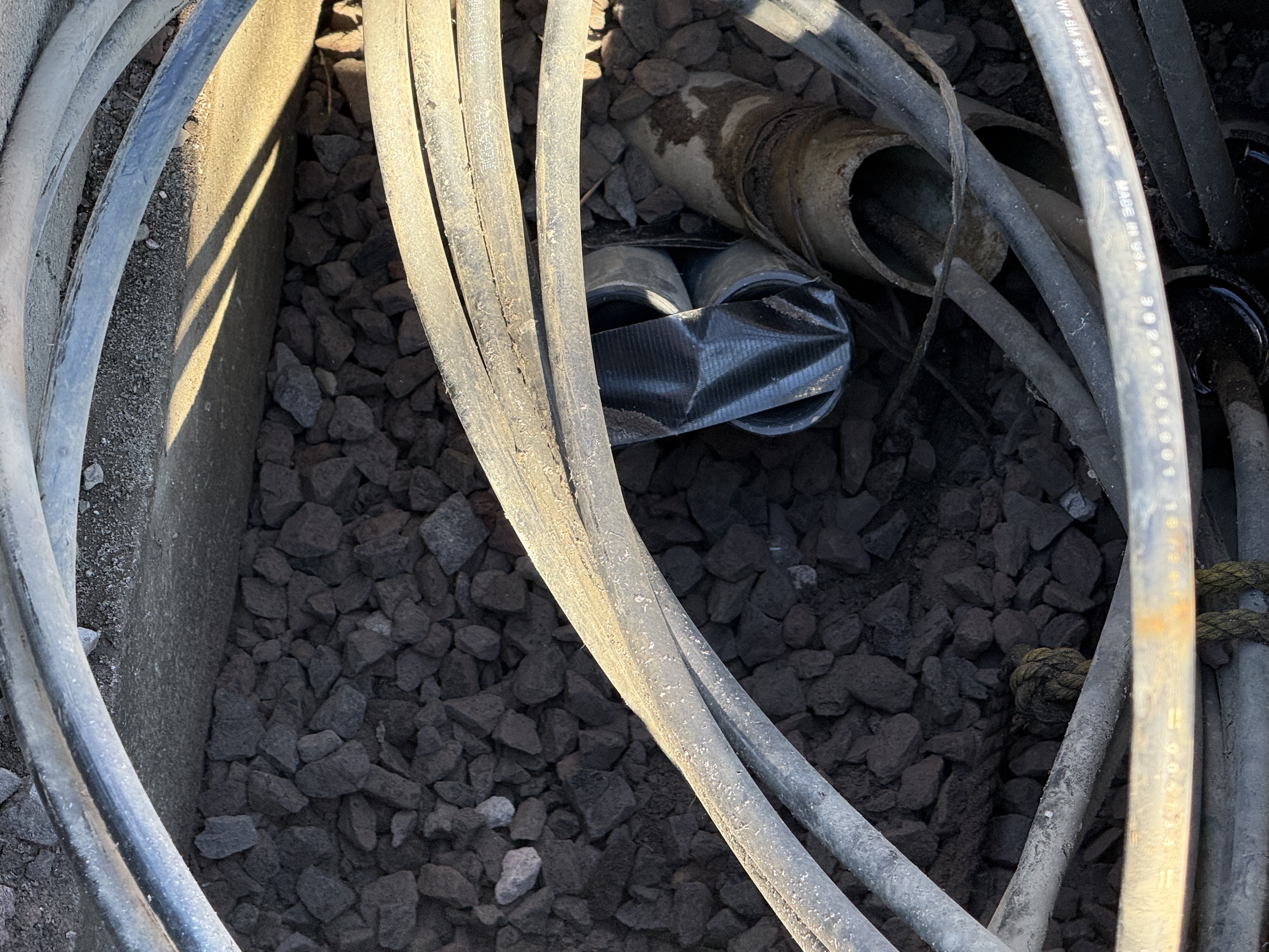 The image shows a construction site with multiple hoses or cables laying on a surface covered with crushed stone aggregate. A section of pipes, some of which are wrapped with duct tape, indicates temporary protection or ongoing repairs. This setup suggests preparation or maintenance work in a mid-phase of an underground utility installation project.