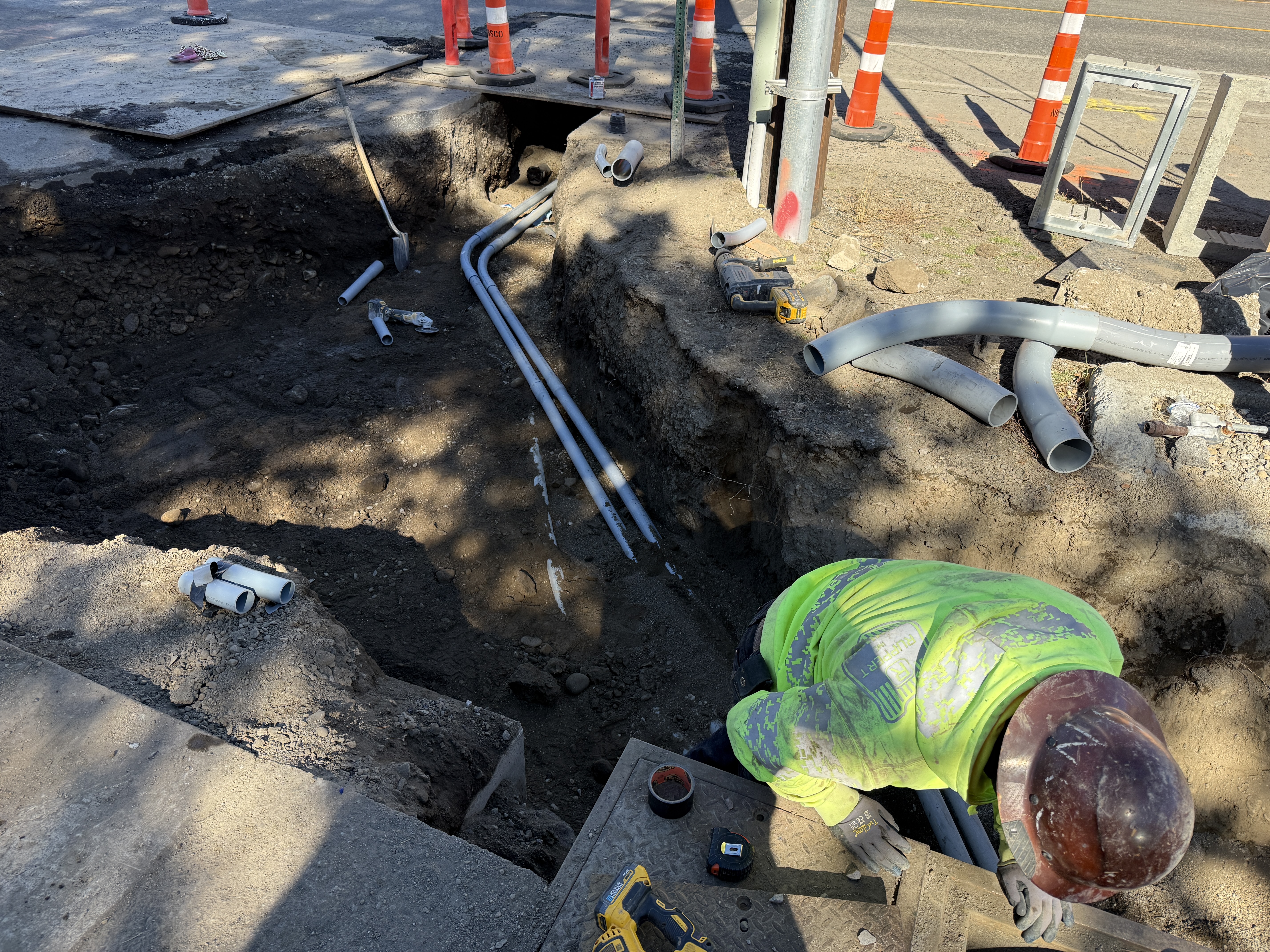 The photo shows a construction worker in a hard hat working inside an excavated trench at a utility infrastructure project. Several PVC conduits are being installed underground, with some sections already connected and others laid out for connection. The site appears to be in the mid-stage of the pipeline installation process, with the trench open and prepared for conduit placement.